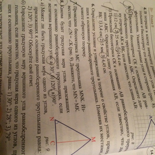 8,а) Сумма углов треугольника равна 180°, сумма углов равнобедренного треугольника, прилежащих к основанию должна быть меньше 180°. Значит каждый угол при основании в равнобедренном треугольнике должен быть меньше 90°.