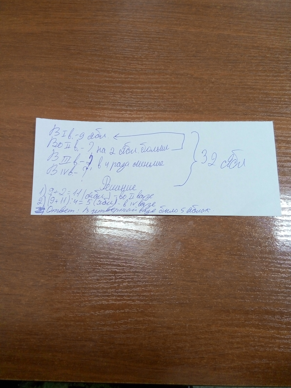 В первой вазе лежало 9 яблок,а во второй-на 2 яблока больше,чем в первой. В третей вазе было в 4 раза меньше яблок,чем в первой и второй вазах вместе.Всего во всех вазах лежало 32 яблока.Сколько яблок было в четвёртой вазе?
