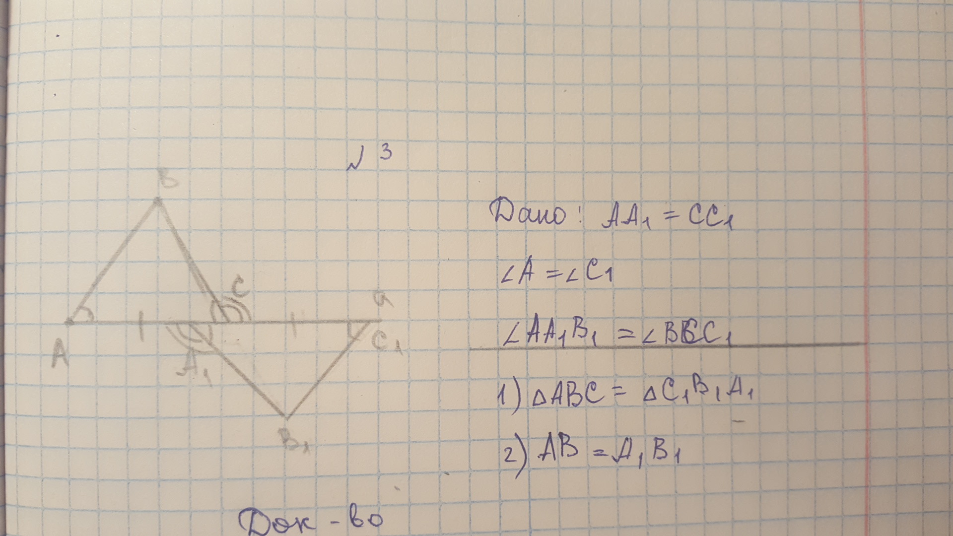 там по углам на одной прямой находишь следующие углы у двух треугольников(там один прилежащий при стороне известен,а другой нет,вот его мы и находим) Получается,треугольники равны, а эти АB=A1B1 равны из-за этих углов,которые мы нашли.