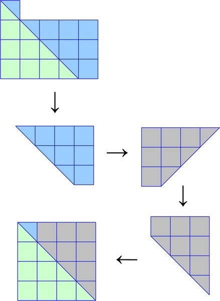 попробуй догадаться,как одним взмахом ножниц разрезать эту фигуру на части, из которых можно сложить квадрат.