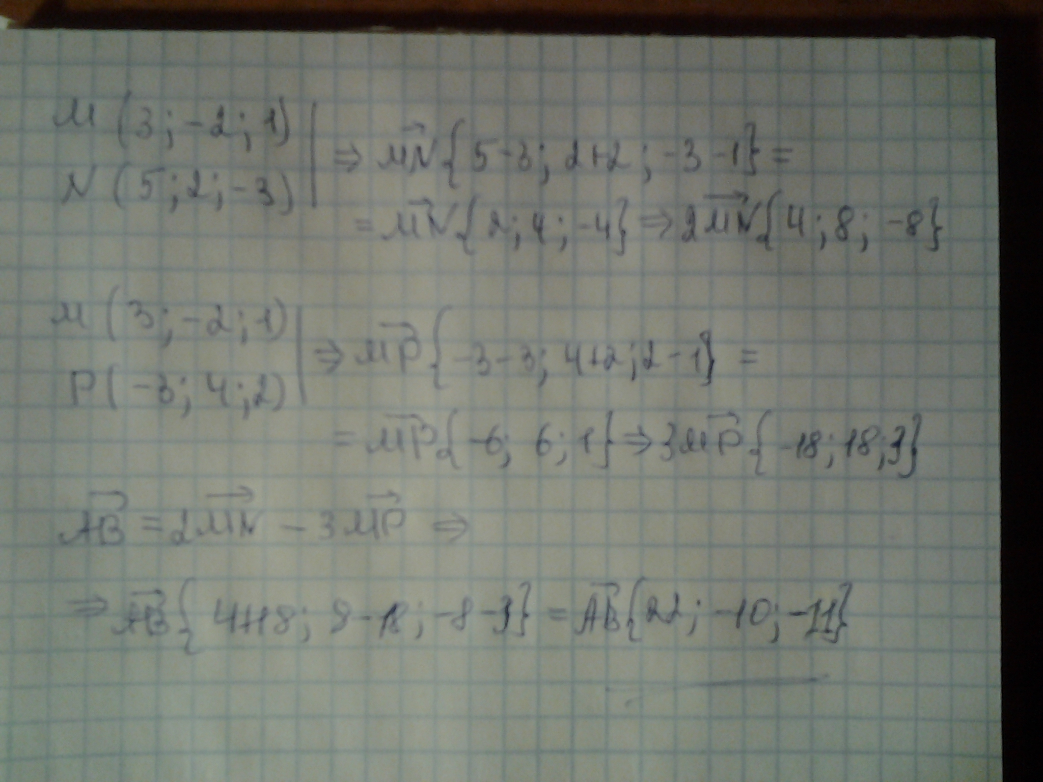 ПОМОГИТЕ ПОЖАЛУЙСТА!!!!!!!!!!!!!!!!!ОЧЕНЬ СРОЧНО НУЖНО!!! 1) Найдите координаты вектора AB=2MN-3MP Если M(3,-2,1) N(5,2,-3) P(-3,4,2)