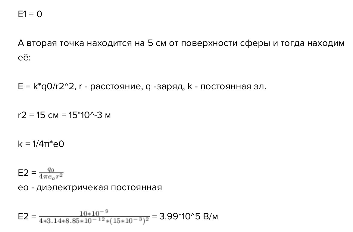 В центре металлической сферы радиуса R=0,1 м и зарядом q=30 нКл находится точечный отрицательный заряд q0=-10 нКл. Найти модуль напряженности поля и потенциалы в точках, отстоящих от центра сферы на расстоянии r1=5 см и r2=15 см.
