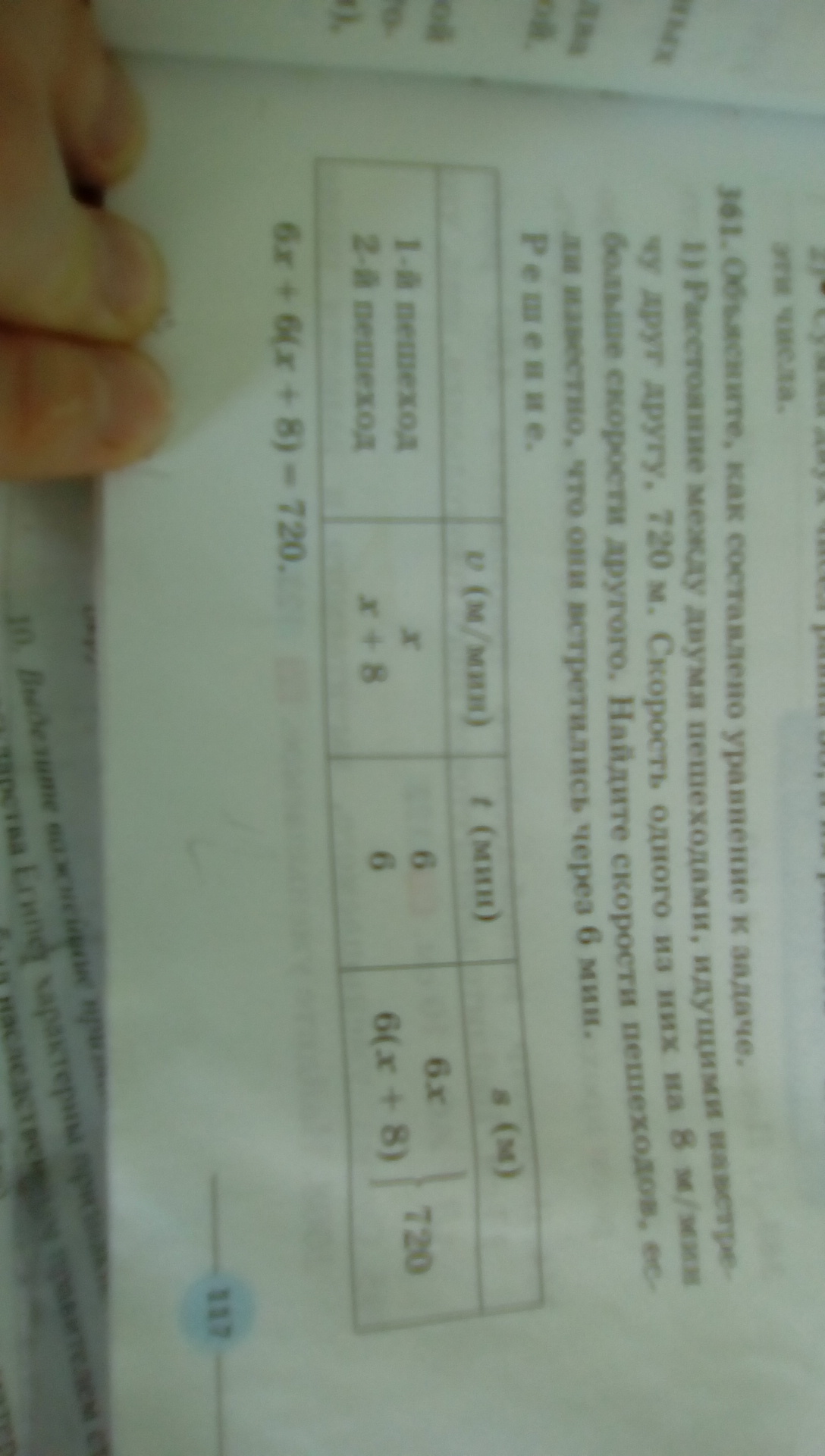 пусть x-скорость пешехода 1,тогда (x+8)-скорость пешехода 2, так как они затратили на путь 6 мин.,6*x-это путь который прошёл пешеход 1,а 6*(x+8)-это путь который прошёл пешеход 2,так как расстояние между ними было 720 м,то составим уравнение : 6*x+6*(x+8)=720,решаем уравнение