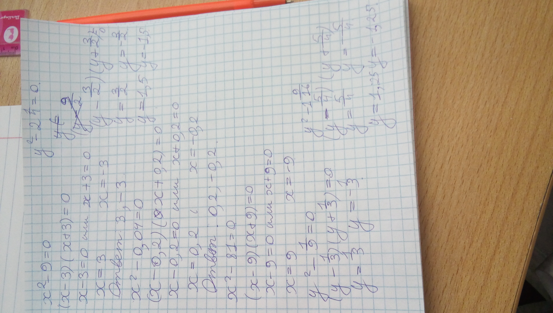 решите уравнение: x^2-9=0; х^2-0,04=0 ; х^2-81=0; у^2-1/9=0; у^2 - 1 9/16 =0; у^2-2 1/4 = 0 Помогите пожалуйста