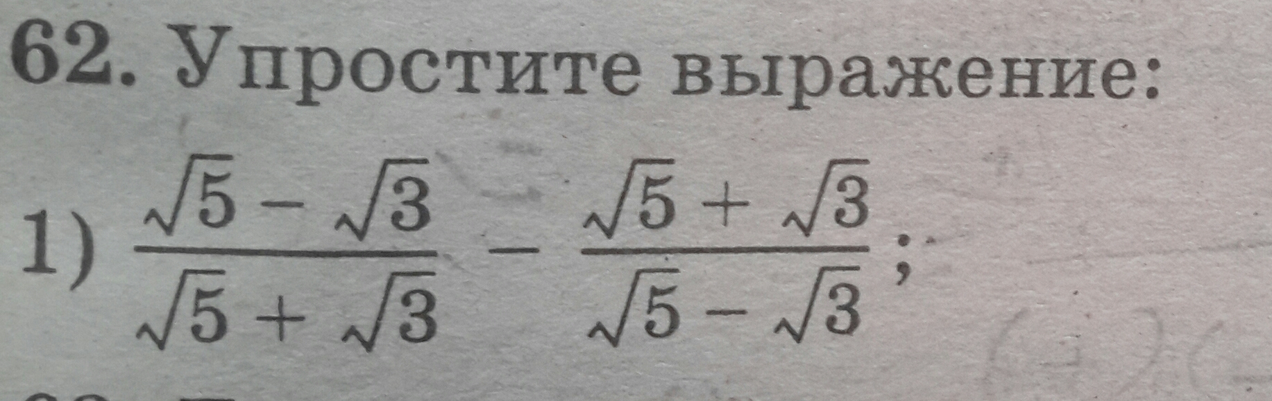 (√5-√3)/(√5+√3)-(√5+√3)/(√5-√3)=(〖(√5-√(3))〗^2-(√5+√3)^2)/(5-3)=(5-2√15+3-5+2√15+3)/2=9/2=4.5