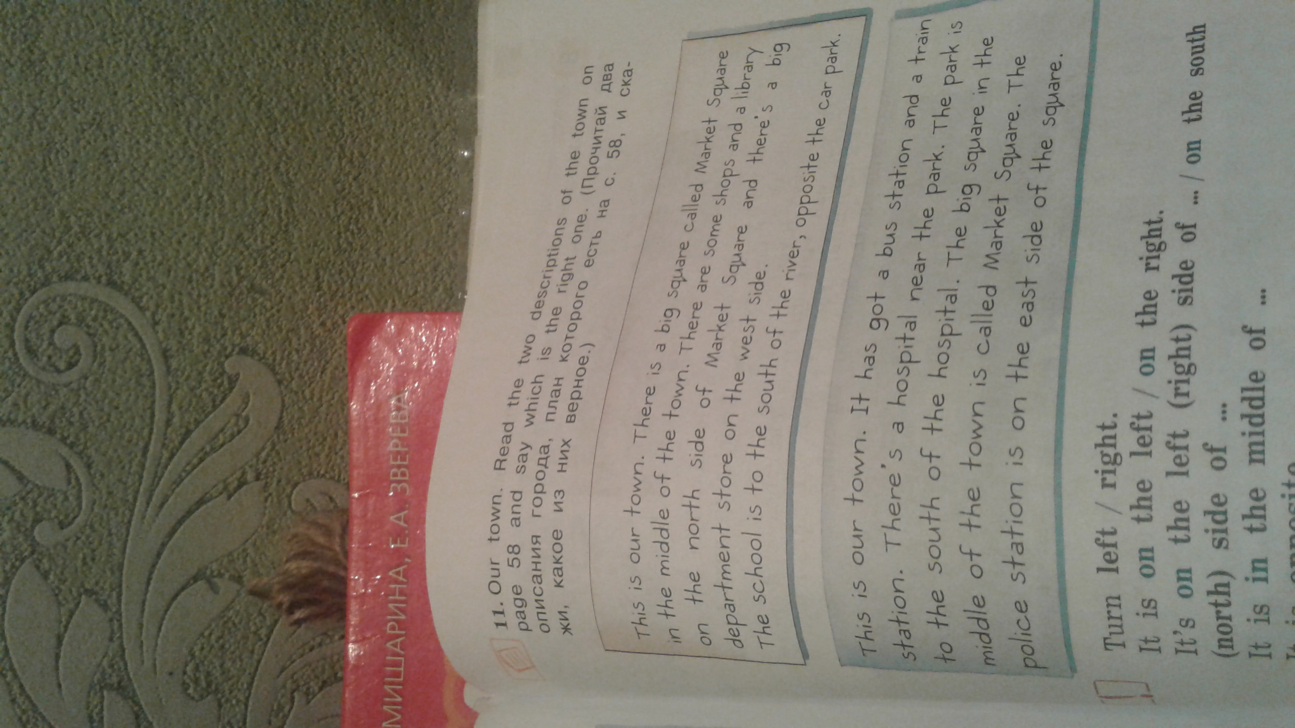 Это наш город. Тут есть автобусная остановка, и также железнодорожная станция. Есть больница возле парка. Парк находится к югу от больницы. Большую площадь в центре города называют Рыночной. Полицейский участок находится на восточной стороне площади.