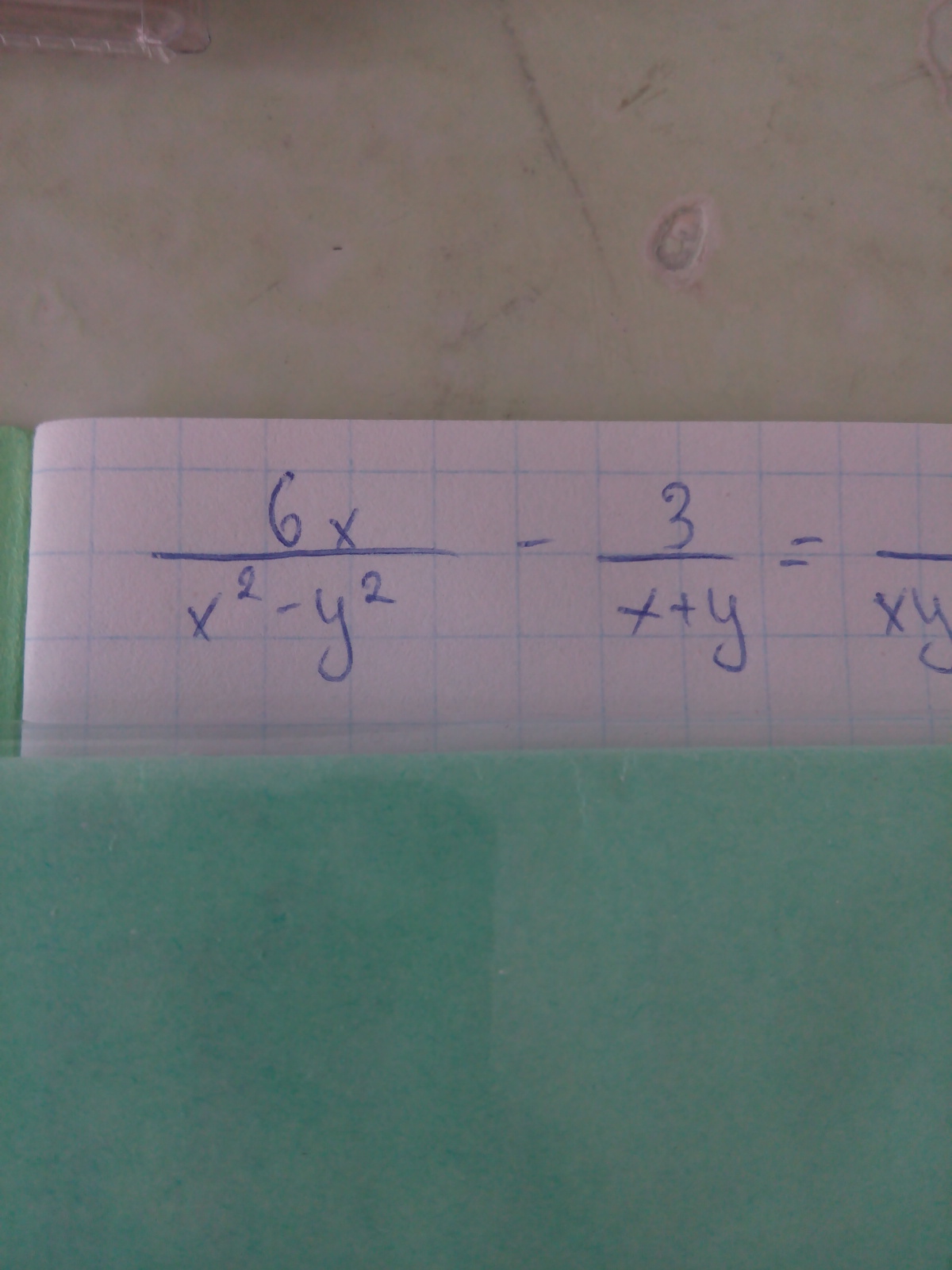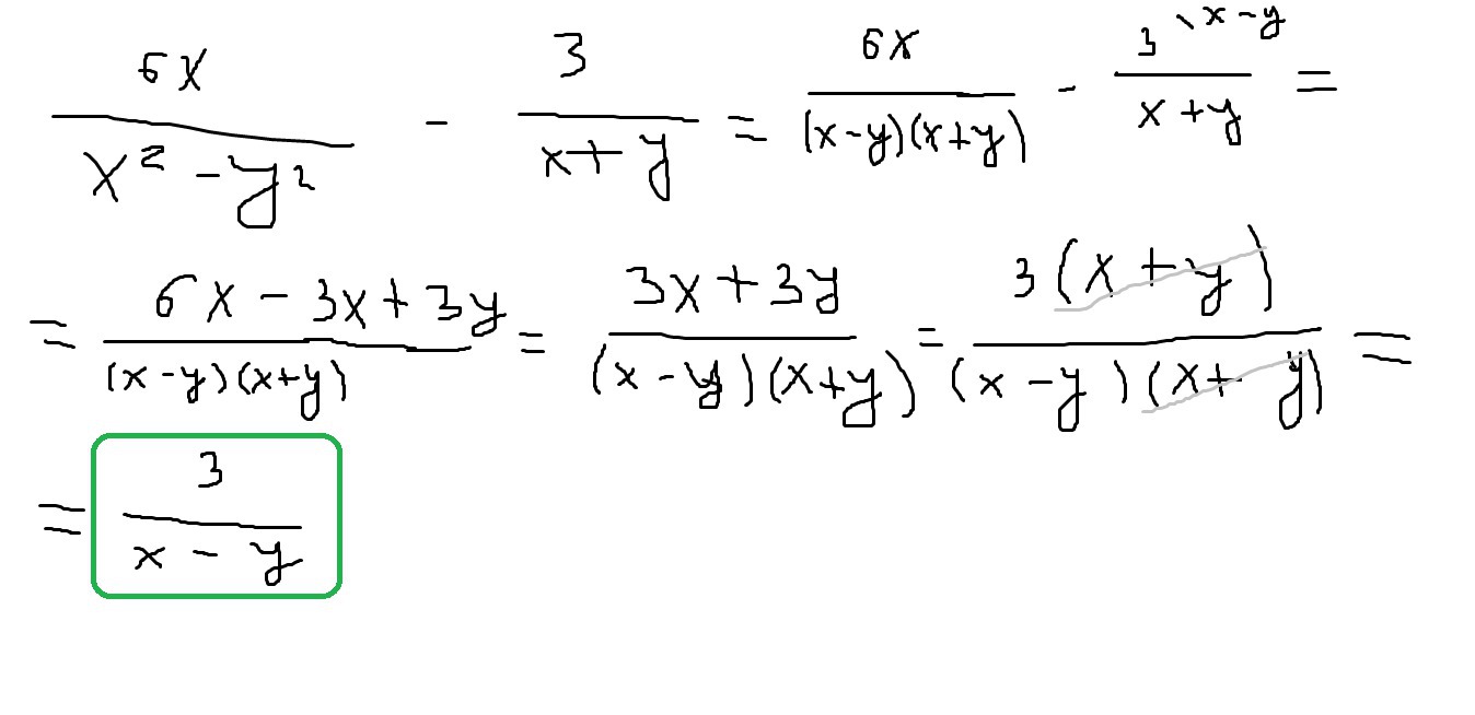 6х/(х-у) (х+у) - 3/(х+у) = 6х/(х-у) (х+у) - 3х+3у/(х-у) (х+у) = 6х-3х+3у/(х-у) (х+у) = 3х+3у/(х-у) (х+у) = 3(х+у) /(х-у) (х+у) = 3/х-у. там я сократила х+у