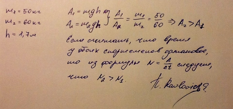 Два спортсмена массой 50 кг и 60 кг прыгнули на высоту 1 м 70 см. Какой из спортсменов а) совершил большую работу;б)развил большую мощность?помогите пожалуйста, срочно!!)