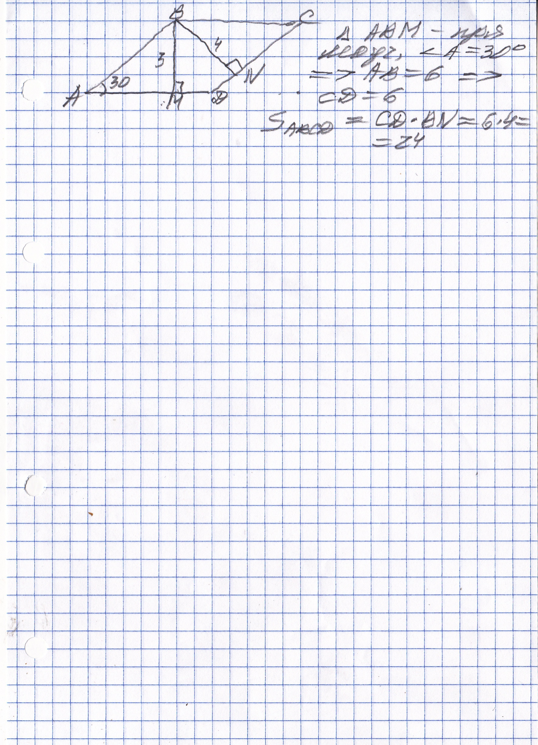 Острый угол параллелограмма равен 30 градусов, а высоты, проведённые из вершины тупого угла, равны 4 см и 3 см. Найти площадь этого параллелограмма