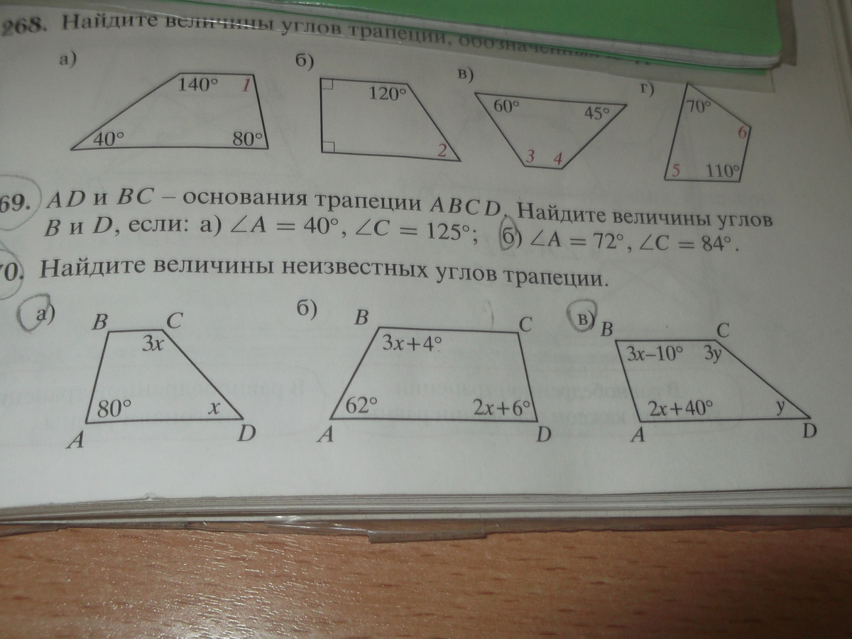 1)Сумма углов прилежащих к боковой стороне трапеции= 180 градусов.