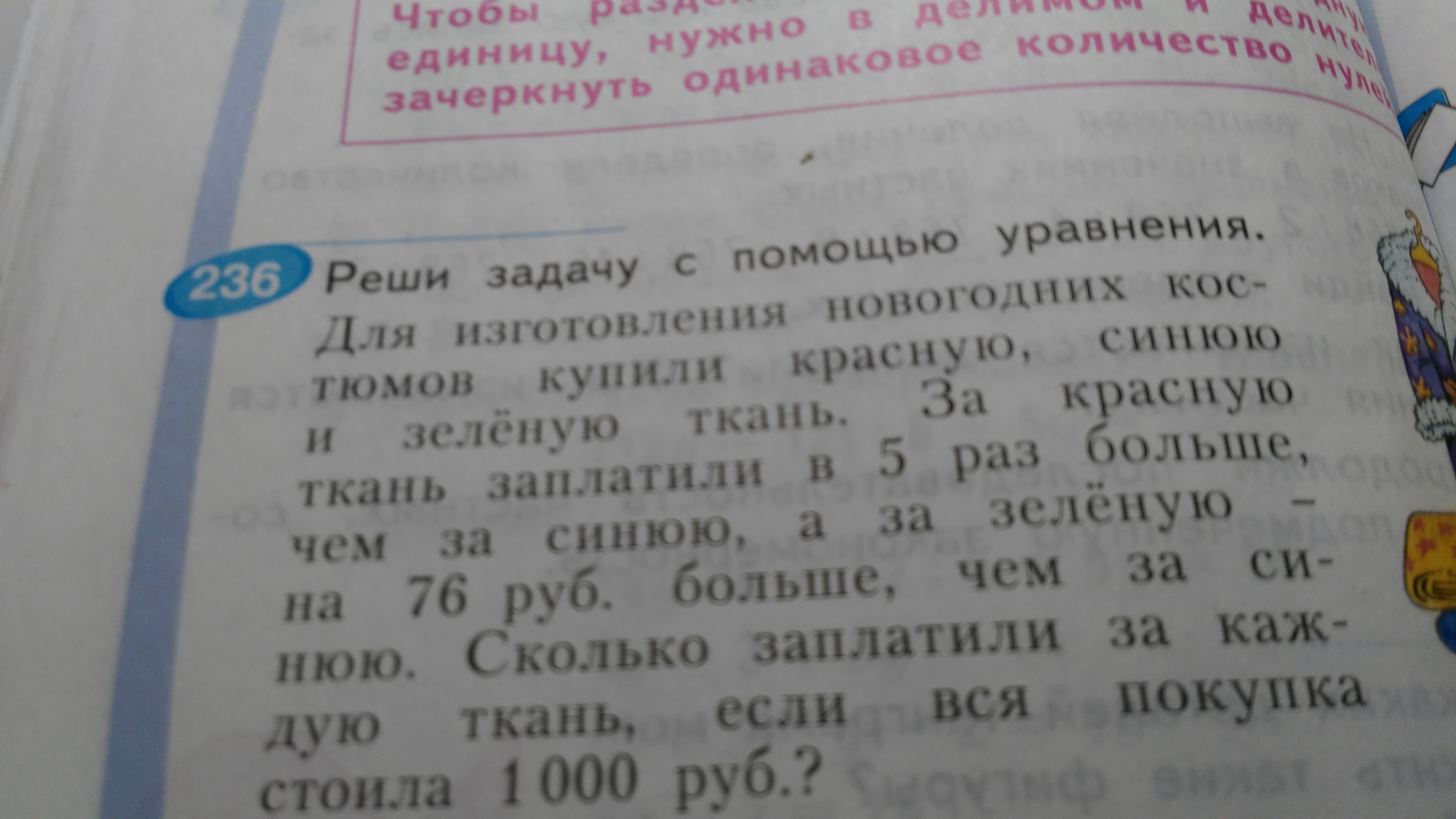 пусть за синюю ткань заплатили х руб. Тогда за красную - (5х) руб, а за зелёную - (х=76) руб. Зная , что всего за покупку отдали 1000, составим и решим уравнение: