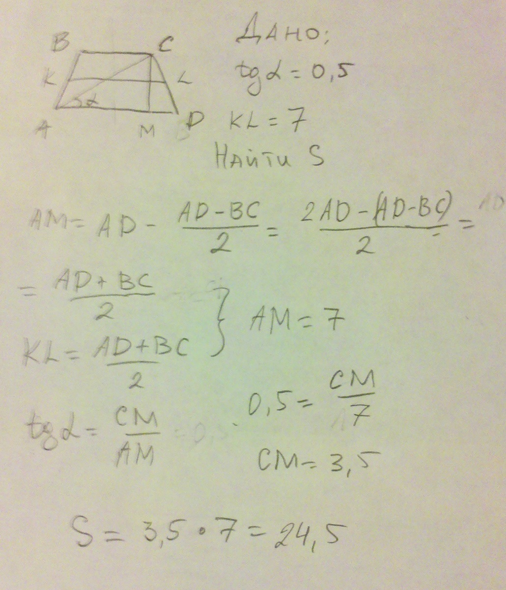В равнобедренной трапеции tg угла между диагональю и основанием равен 0,5. А длина средней линии равна 7. Найдите площадь трапеции.