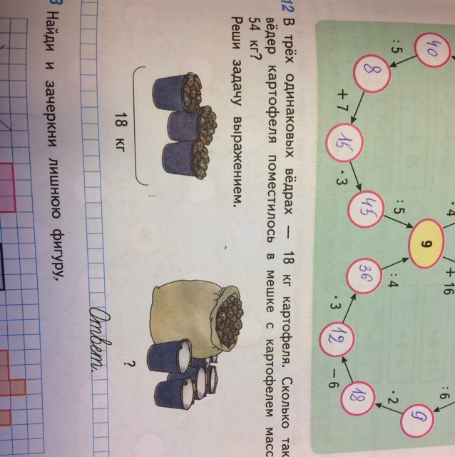 В трёх одинаковых вёдрах - 18 кг картофеля. Сколько таких вёдер картофеля поместилась в мешке с картофелем массой 54 кг? Реши задачу выражением. Помогите пожалуйста. (За рание спасибо ^.^)