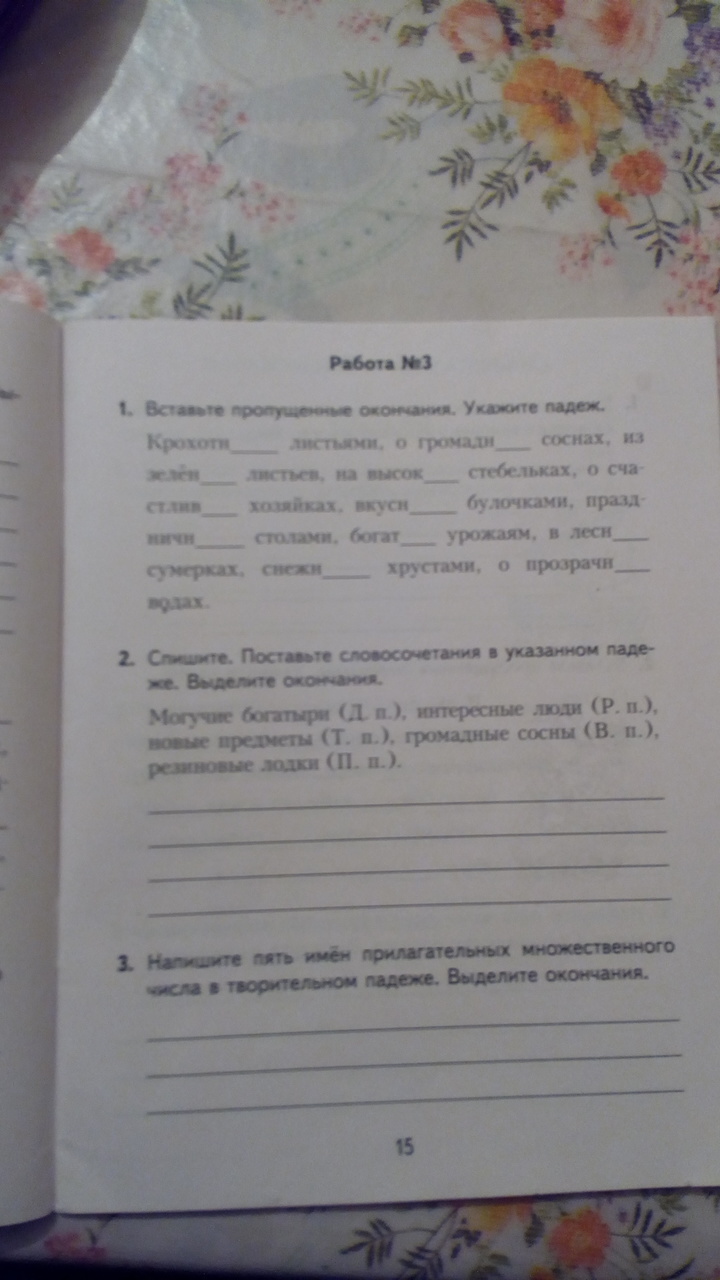 1. Крохотными листьями (т.п.), о громадных соснах (п.п.), из зеленых листьев (р.п.), на высоких стебельках (п.п.), о счастливых хозяйках (п.п.), вкусными булочками (т.п.), праздничными столами (т.п.), богатым урожаям (д.п.), в лесных сумерках (п.п.), снежными хрустами (т.п.), о прозрачных водах (п.п.).