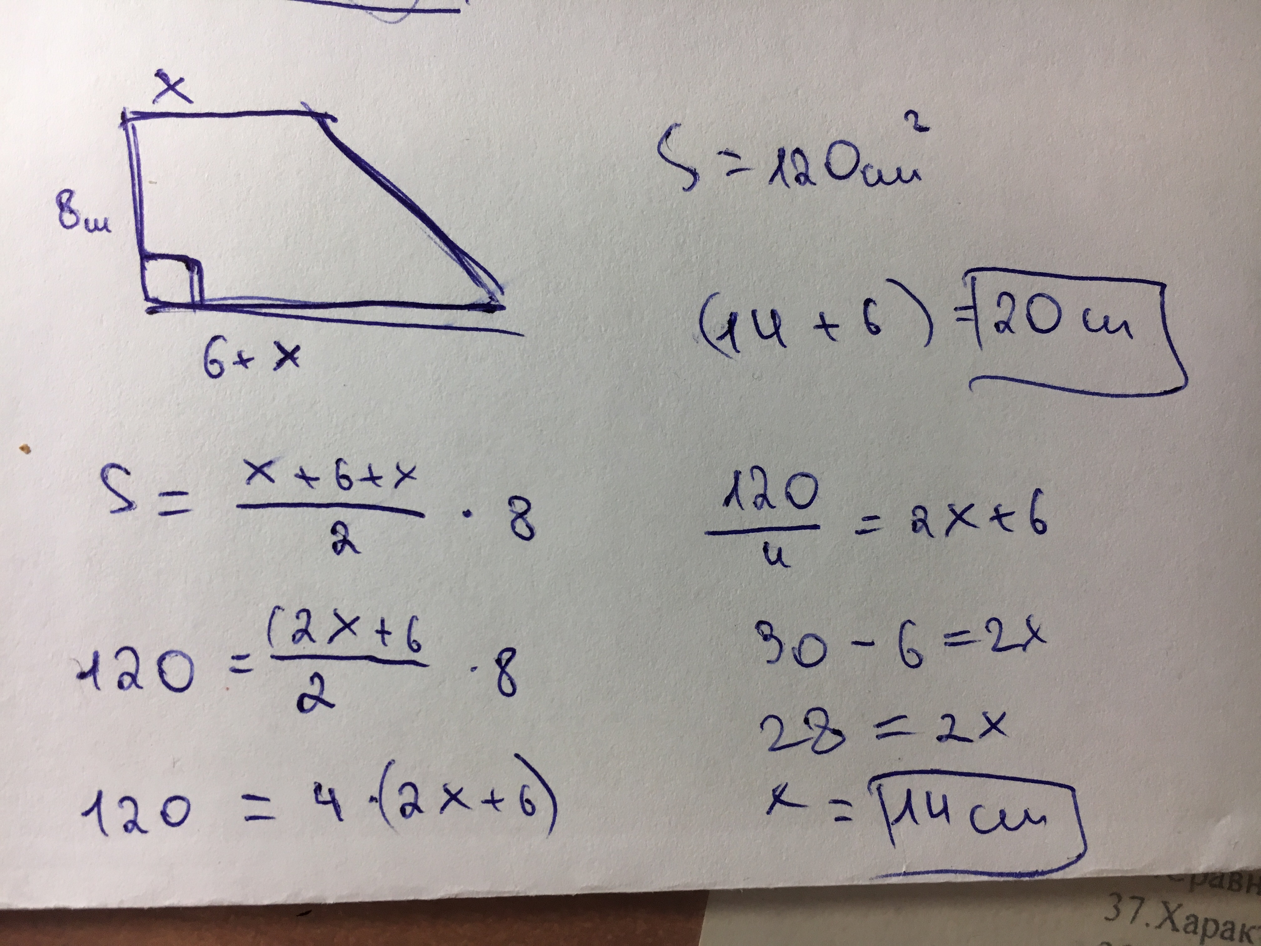 площадь прямоугольной трапеции равна 120 см в квадрате А ее высота 8 сантиметров одно основание трапеции на 6 сантиметров меньше другой найдите длину Основания трапеции