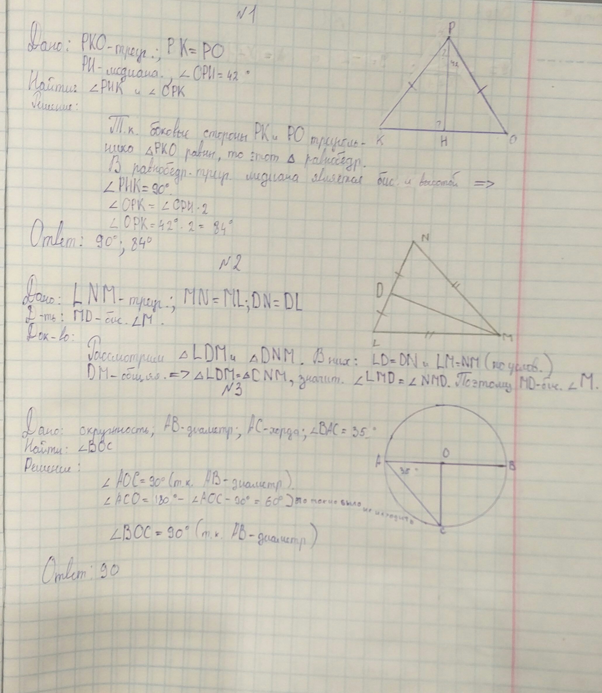 №1. Стороны РК и РО треугольника РО равны, РН – его медиана. Найдите углы РНК и ОРК, если угол ОРН равен 420.
