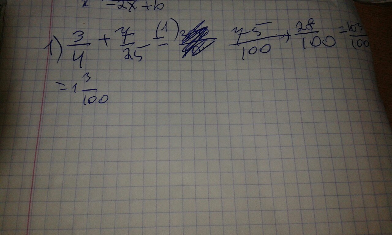 Где стоит 1 , привела к общему знаменателю 100, т.е 3*25 и 7*4 , потом сложила числители и выделила целую часть
