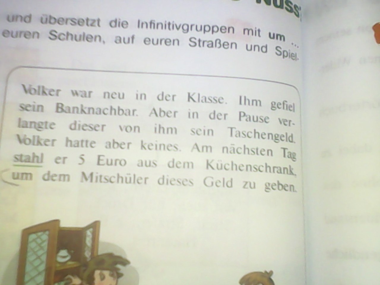 Фолькер был в классе новеньким. Ему нравился его сосед по парте. Но на перемене он попросил у него карманные деньги. У Фолькера ничего не было. На следующий день он украл из кухонного шкафа 5 евро, чтобы отдать их однокласснику.