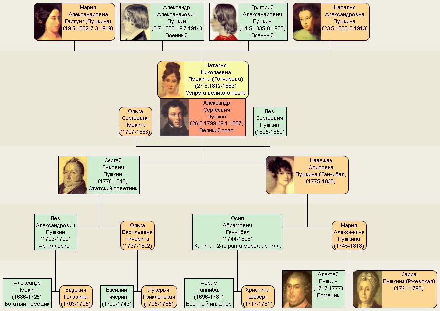 Отец Пушкина был также из семьи военнослужащих, и с самого рождения его записали в армию. Его отец, Лев Александрович, ушел в отставку подполковником. Поэт, вспоминая о деде, говорил, что тот был жестким и даже жестоким человеком. Сергей Львович рано женился и переехал в Москву из Петербурга. Состоял на службе в Комиссариатском депо, позже служил в Варшаве. Отец Пушкина имел отличное французское образование и был талантливым поэтом-любителем. Семья Пушкина была очень большой, но по стечению трагических и временных обстоятельств из семи братьев и сестер в живых остались только двое - старшая сестра Ольга и брат Лев. Ольга Сергеевна росла очень начитанной девушкой, не чуждо ей было и творчество. Со своим братом Александром она была очень дружна, они много вместе гуляли и беседовали. Впоследствии Пушкин посвятит сестре несколько стихотворений. Брат Пушкина, Лев Сергеевич, был его близким другом и литературным секретарем. Участвовал в персидско-турецкой, польской кампании, некоторое время жил в Варшаве. С 1836 года служил штабс-капитаном на Кавказе, где и узнал о гибели брата. Для Льва это была настоящая трагедия, он даже хотел сам стреляться с Дантесом.Жена Александра Пушкина - Наталья Гончарова - родилась в 1812 году в семье потомственного дворянина Николая Гончарова и его жены Натальи Николаевны, фрейлины императрицы. Они познакомились в 1828 году на балу. Через несколько месяцев Пушкин уже просил у ее родителей благословления. Но венчались они только в 1831 году. Первое время супруги жили в уединении в Царском Селе, но потом были вынуждены вернуться в Петербург, поскольку Наталью пригласила ко двору императрица. В 1832 году у супругов родился первенец - дочь Мария. Семья Пушкина находилась в затруднительном материальном положении, поскольку жизнь в Петербурге была не из дешевых. В 1835 году состоялось знакомство Натальи с Дантесом, французским подданным. Эта роковая встреча послужит в будущем причиной обвинений Натальи Николаевны во всех бедах. 27 января состоялась трагическая дуэль, унесшая жизнь великого поэта. Жена до последней минуты находилась с ним. После похорон Гончарова приняла решение покинуть столицу. Теперь главным делом ее жизни была забота о детях.