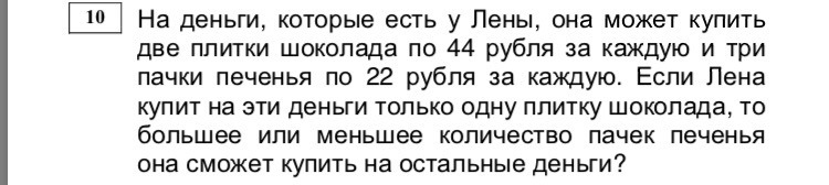 тут главное понять, что денег на 1 шоколад достаточно, чтобы купить 2 печенья, и, если не покупать один шоколад, то ответ понятен ))