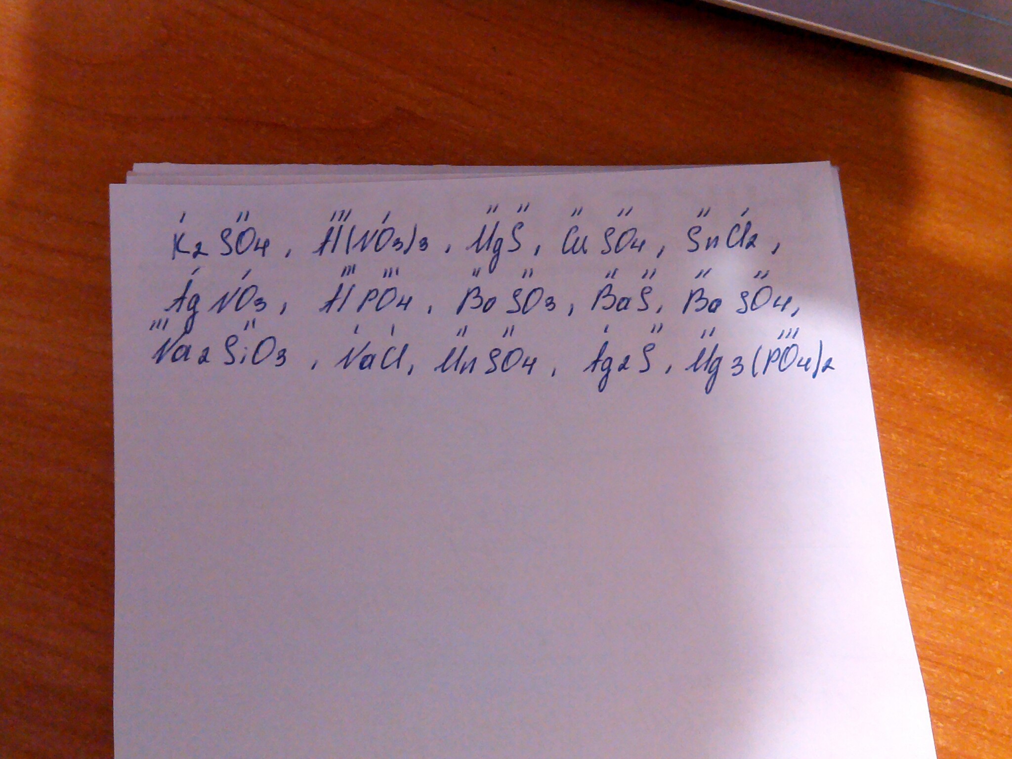 калий сульфат, алюминий нитрат, магний сульфид, купрум сульфат, станум хлорид, аргентум нитрат, алюминий ортофосфат, барий сульфит, барий сульфид, барий сульфат, натрий силикат, натрий хлорид, манган сульфат, аргентум сульфид,магний ортофосфат)