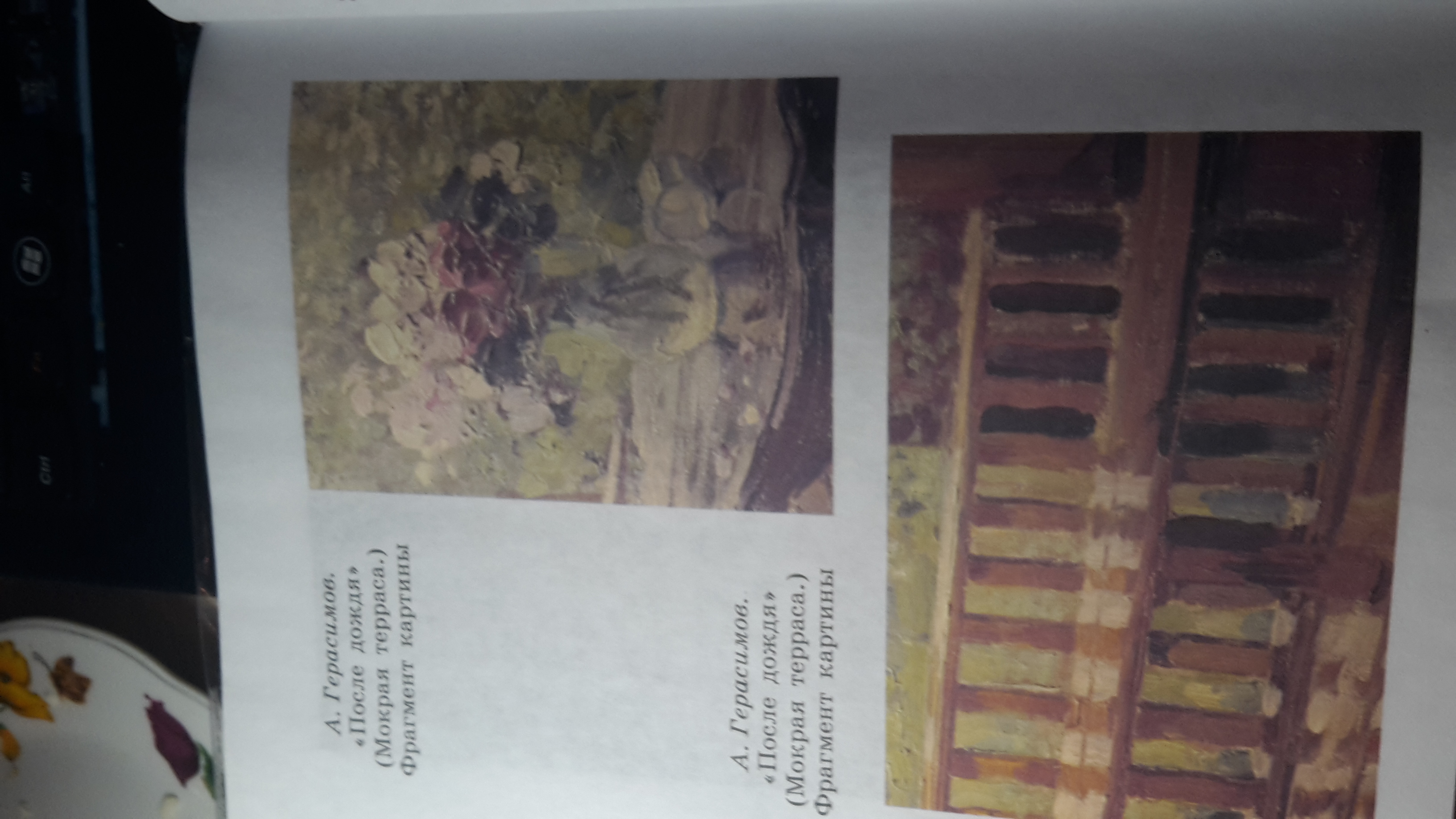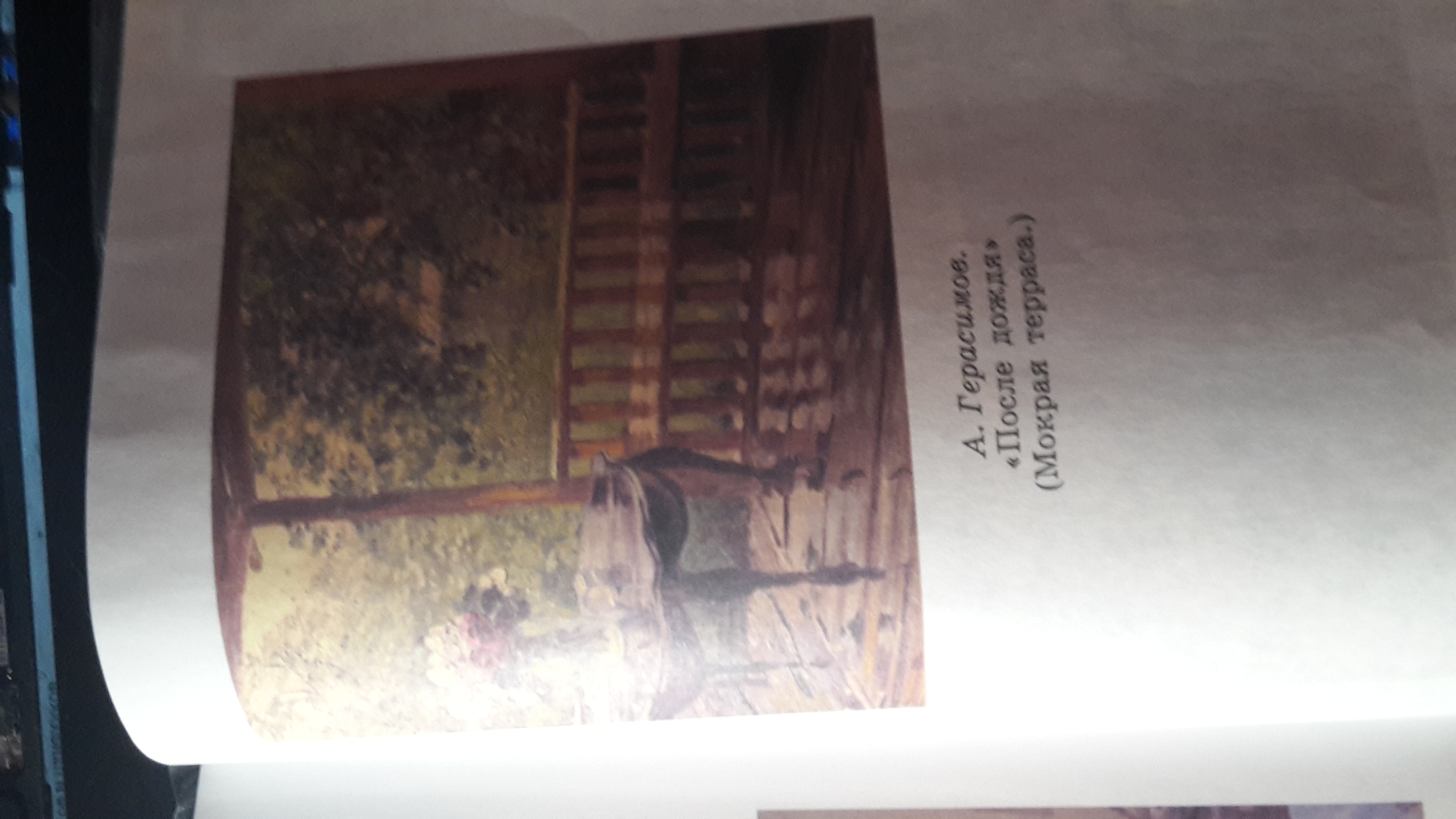 На картине А.Герасимова "после дождя" изображена сырая от дождя терраса. На террасе стоит необычный округлый стол из темного дерева. На нем стоит хрустальная ваза с нежным букетом сирени. Чуть дальше террасы можно разглядеть блестящие от сырости листья деревьев. эта крартина даёт ощущение летней свежести. Создаётся спокойствие и умиротворение на душе.