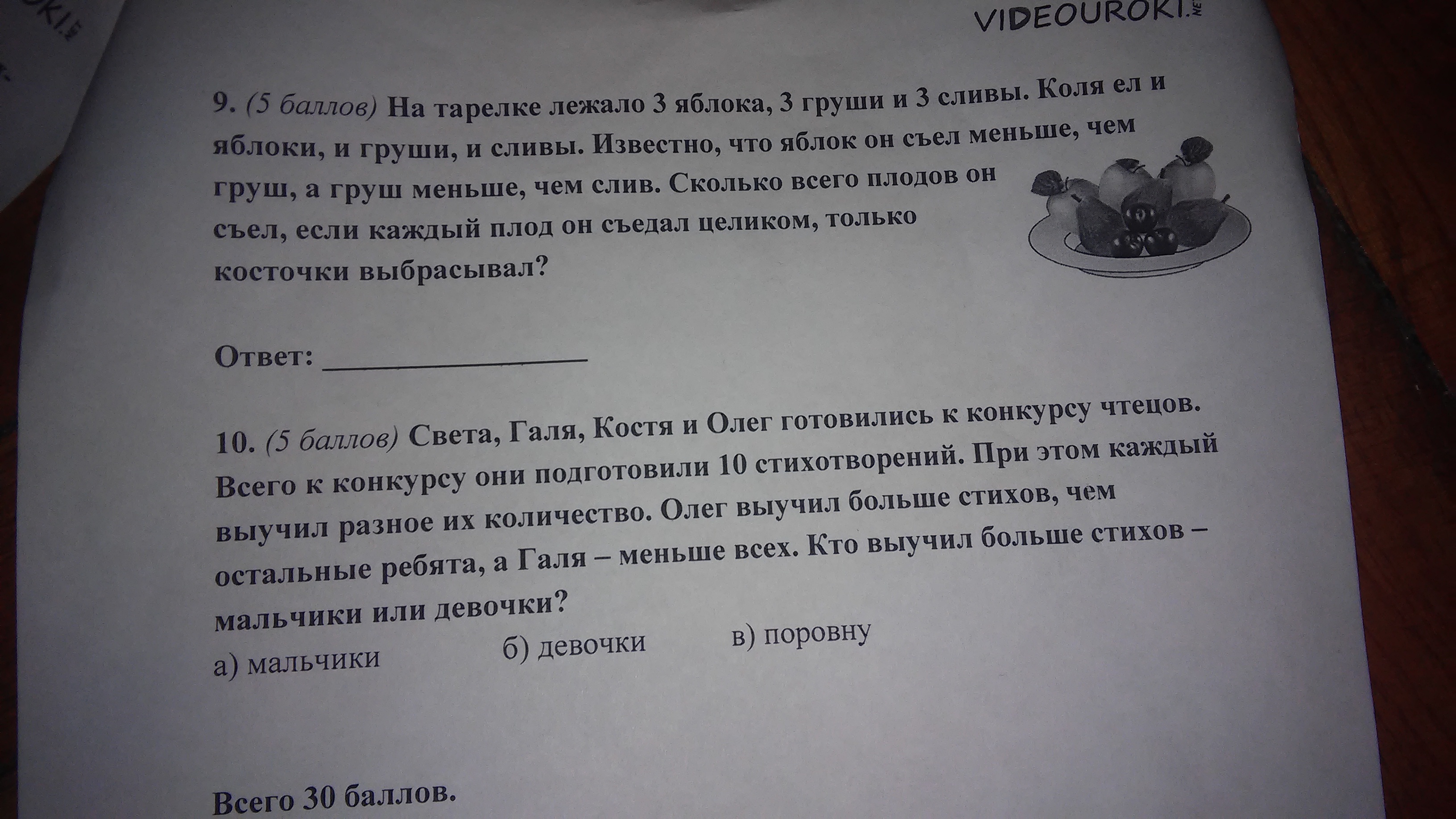 9)вроде 6,яблок меньше чем груш,груш меньше чем слив,как я понял 1 яблоко 3 сливы 2 груши