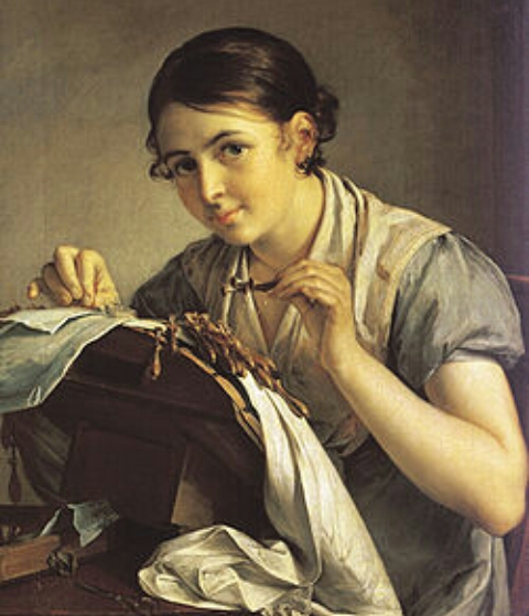 Тропинин, происходивший из семьи крепостных крестьян графа Миниха, в 1823 году в возрасте 47 лет получил вольную. В сентябре того же года он представил Совету Петербургской Академии Художеств картины «Кружевница», «Нищий старик» и «Портрет художника Е. О. Скотникова» для соискания звания художника. Картина «Кружевница» принесла ему славу мастера женских образов и стала значительным явлением в живописном искусстве того времени. Кроме этого полотна в 1820—1830-х годов. Тропинин написал ещё несколько работ, посвящённых образам тружениц-горожанок и их кропотливому труду («Пряха», «За прошивками», «Золотошвейка»).
