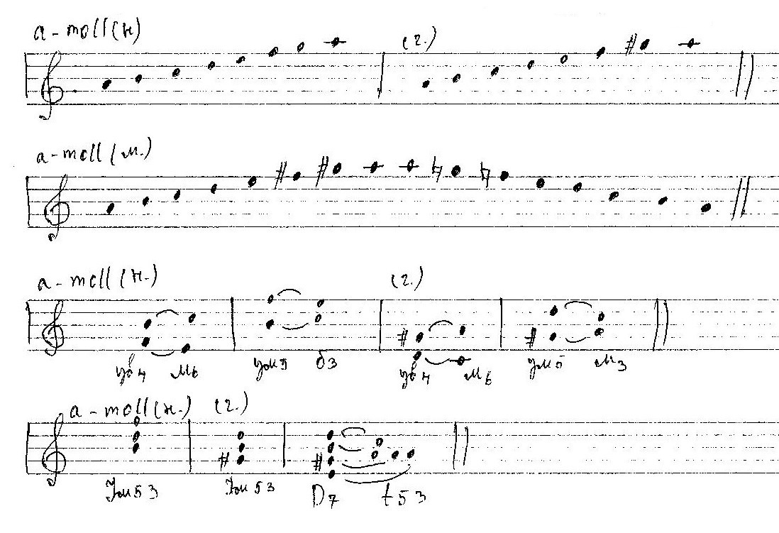 помогите пожалуйста в ля миноре написать гамму в натуральном и гармоническом мелодическом ум5 ув4 ум53 D7 с разрешением по сольфеджио