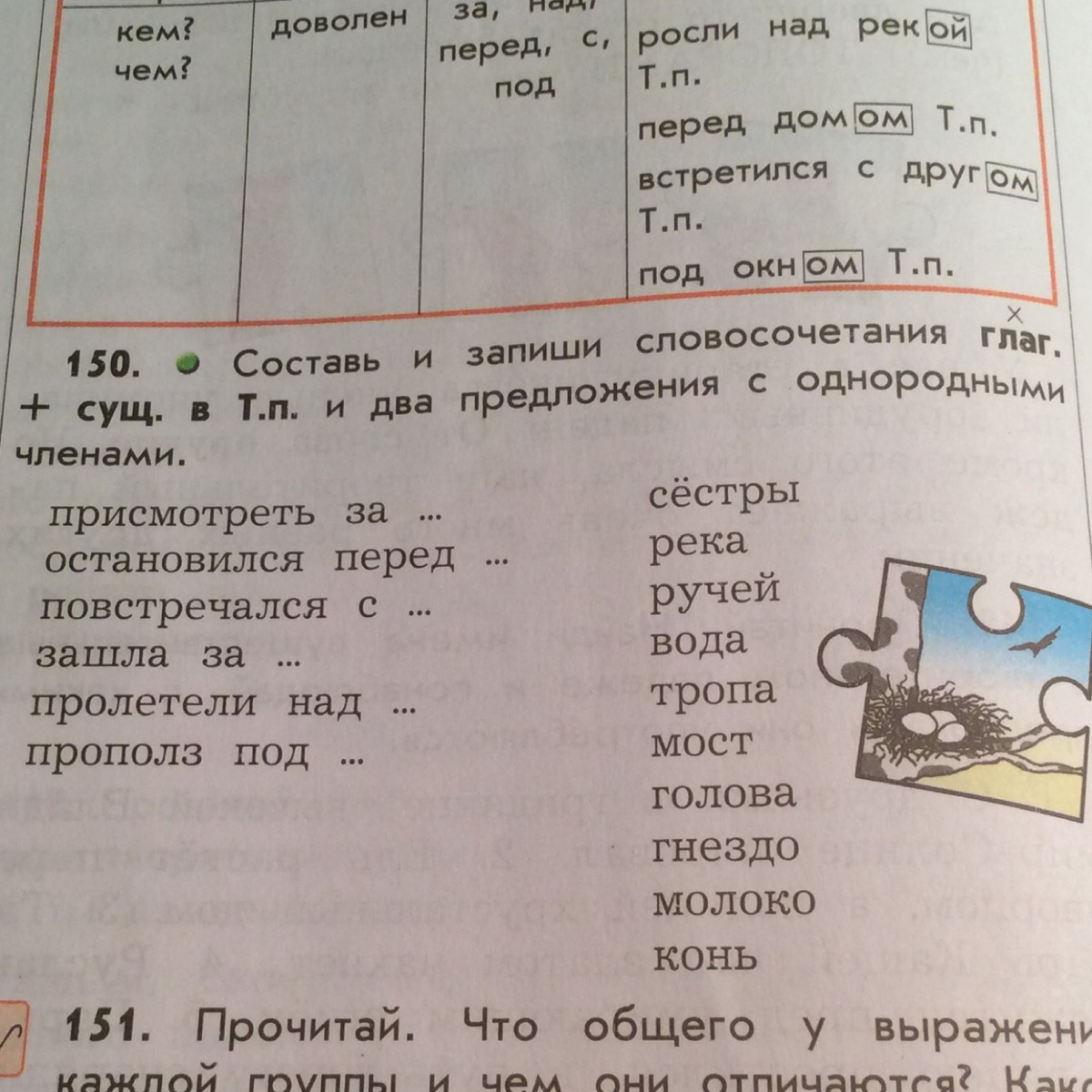 Присмотреть за сестрой, остановится перед рекой, остановился перед ручьём, повстречался с сестрой, зашла за сестру, зашла за коня, пролетели нед рекой, пролетели над ручьём, пролетели над водой, пролетели над тропой, пролетели над мостом, пролетели над головой, пролетели над гнездом, прополз под конём, прополз под мостом.