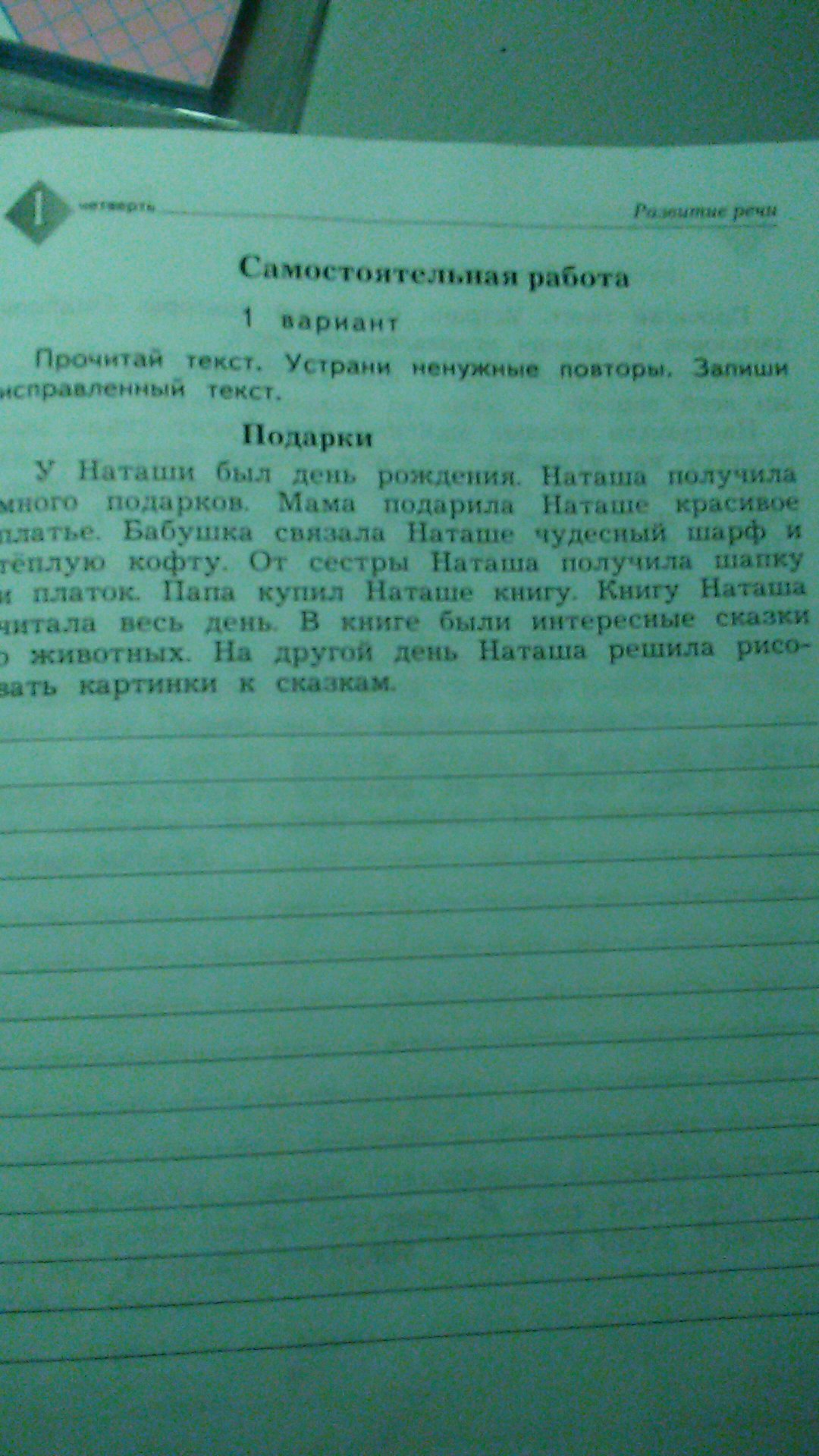 У Наташи был день рождения.Она получила много подарков.Мама подарила ей красивое платье.Бабушка для неё связала чудесный шарф и теплую кофту.От сёстры Наташа получила шапку и платок.Папа подарил книгу.Её читала Наташа весь день.В книге были интересные сказки о животных. На другой день Наташа решила рисовать картинки к сказкам