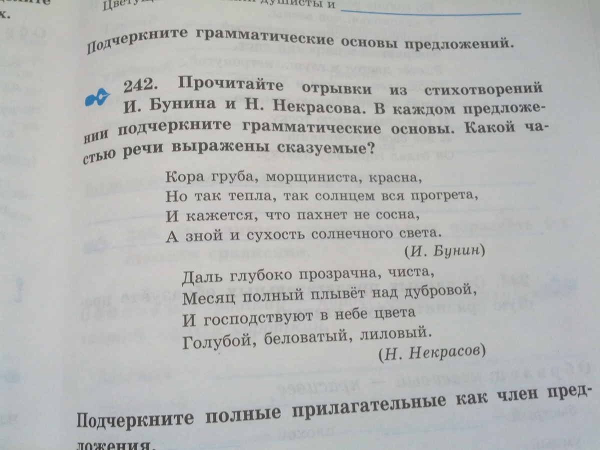 1. Кора груба, морщиниста, красна, тепла, прогрета - кора - подл. одной чертой, остальное двумя - это сказуемые, выраженные краткими прилаг..