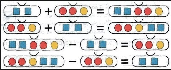 разложи фигуры в мешки так, чтобы везде были одинаковые части и целое и чтобы равенства не повторялись
