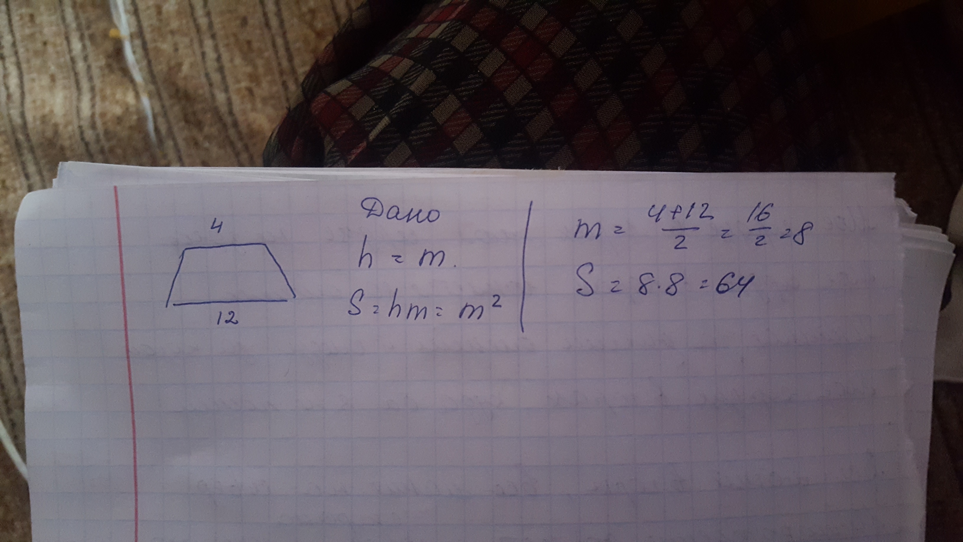 В трапеции основания равны 4 и 12см.. А высота равна полусумме длин оснований. Найдите площадь трапеции.ДАНО.РЕШЕНИЕ.НАЙТИ.
