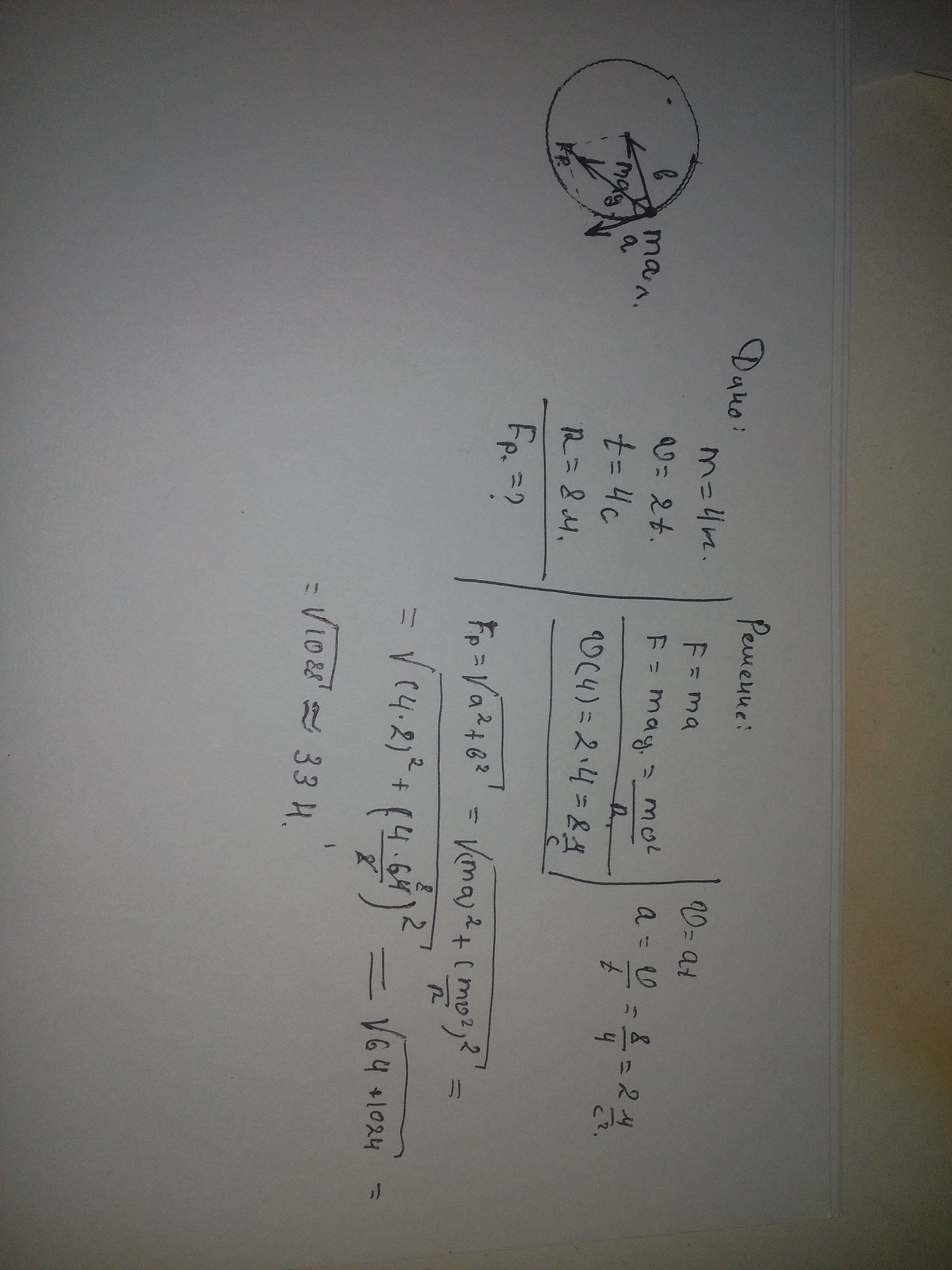 Материальная точка массой m = 4 кг движется по окружности радиуса r = 8 м со скоростью v = 2t м/с. Определить модуль равнодействующей сил, действующих на точку, в момент времени t = 4 с.