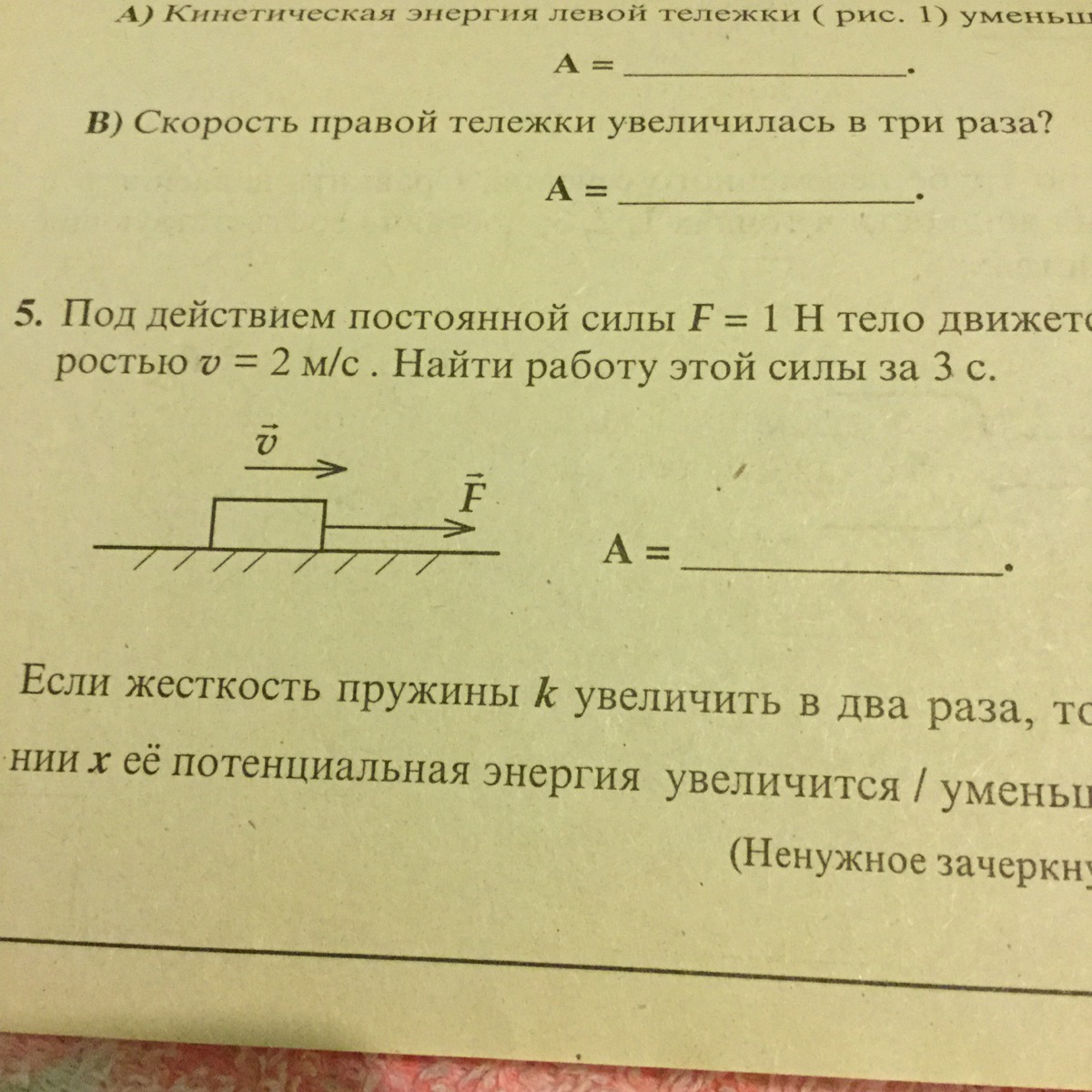 Под действием постоянной силыF=1Н тело движется с постоянной скоростью V=2м/с. Найти работу этой силы за 3 с.