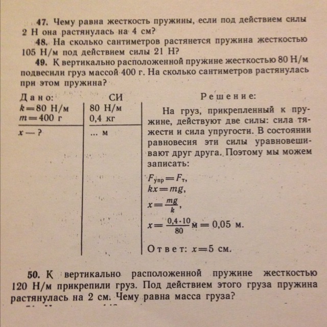 47) по закону Гука F=-kx. k-жёсткость. 4 см=0,04 м. Из этой формулы находим k: k=F/x=2/0,04=50. Жесткость=50