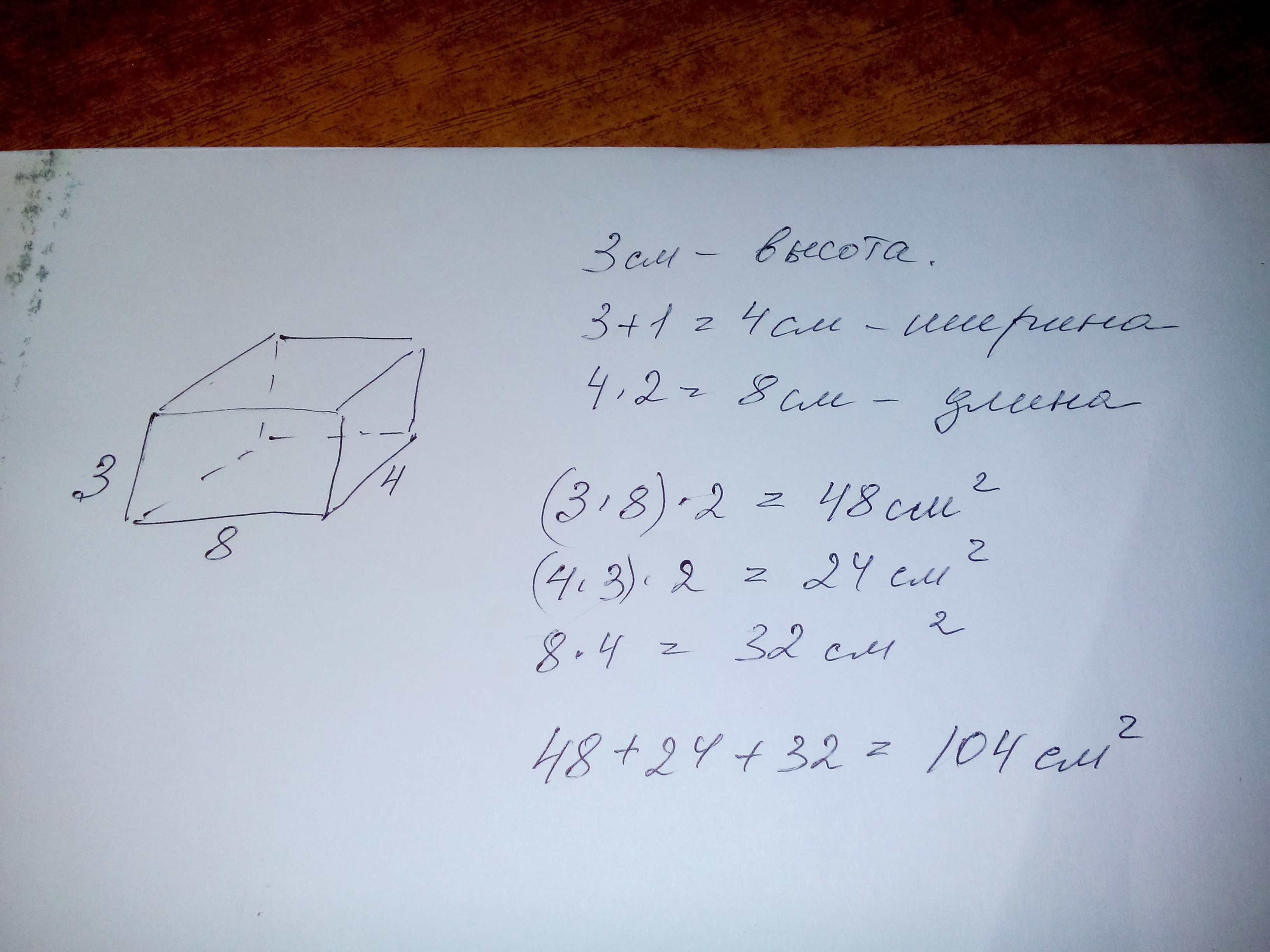 коробка имеет форму прямоугольного параллепипеда без крыши, высота которого 3см,что на 1см меньше ширины. Сколько потребуется бумаги для оклейки коробки снаружи, еслидлина в двое больше ширины?