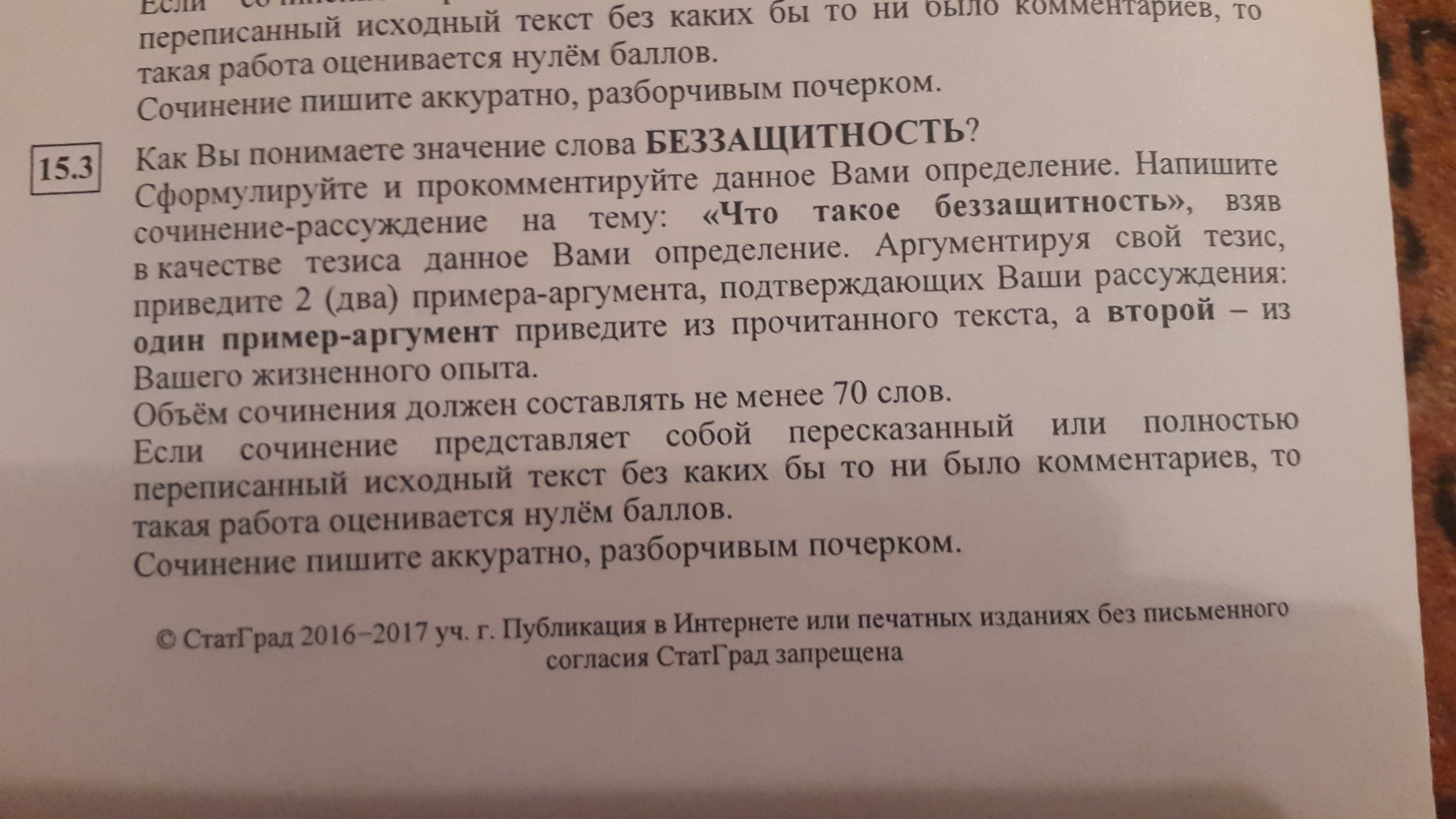 Там свое напишешь в первом обзаце.Второй обзац напиши например о беззащитности животных,3 обзац выбери из интернета какой нибудь рассказ(например Чехов беззащитное существо,оттуда что то возьми).И в конце : изходя из написанного можно сделать вывод то что беззащитность бывает такая сякая(этого писать не надо),там беззащитный люди они находятся без защиты.Само сочинение писать не буду,своей головой надо думать!