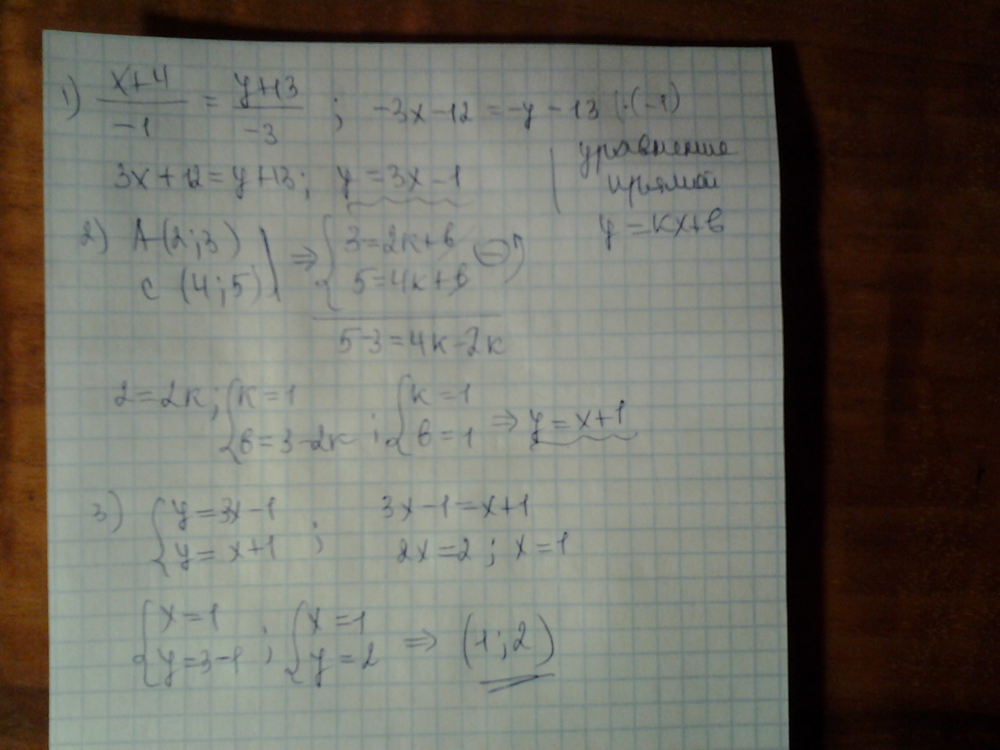 найти точку пересечения прямой (x+4)/-1=(y+13)/-3 и прямой,проходящей через точки A(2;3) и C(4;5)