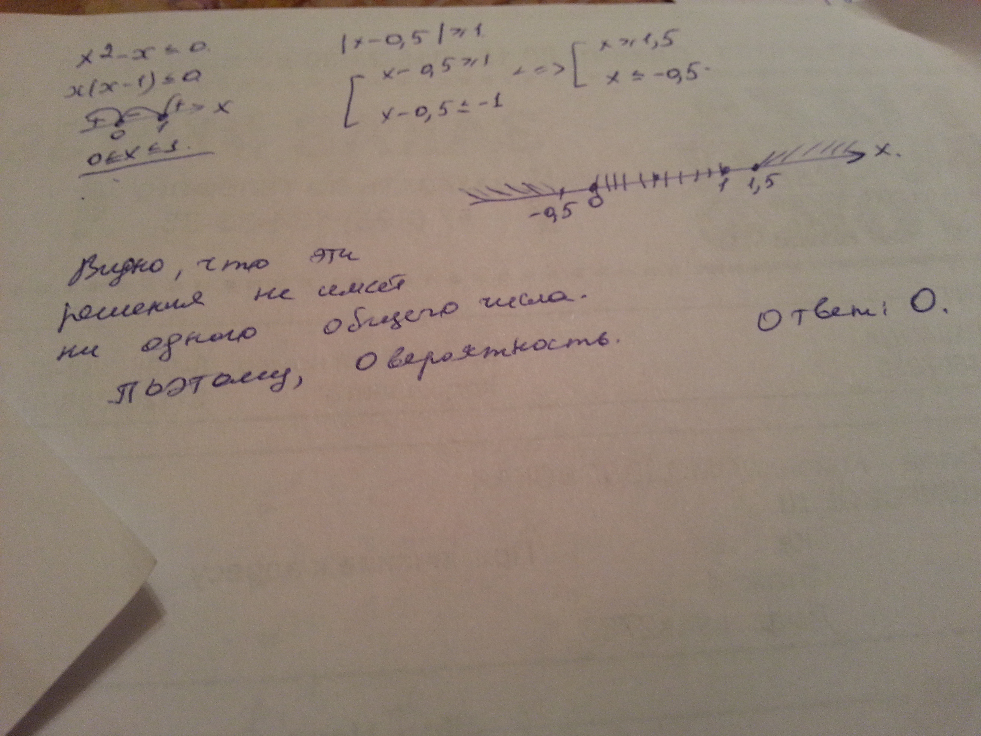 Какова вероятность того, что случайным образом выбранное решение неравенства x2-x<=0 также является решением неравенства |x-0,5|>=1 ??