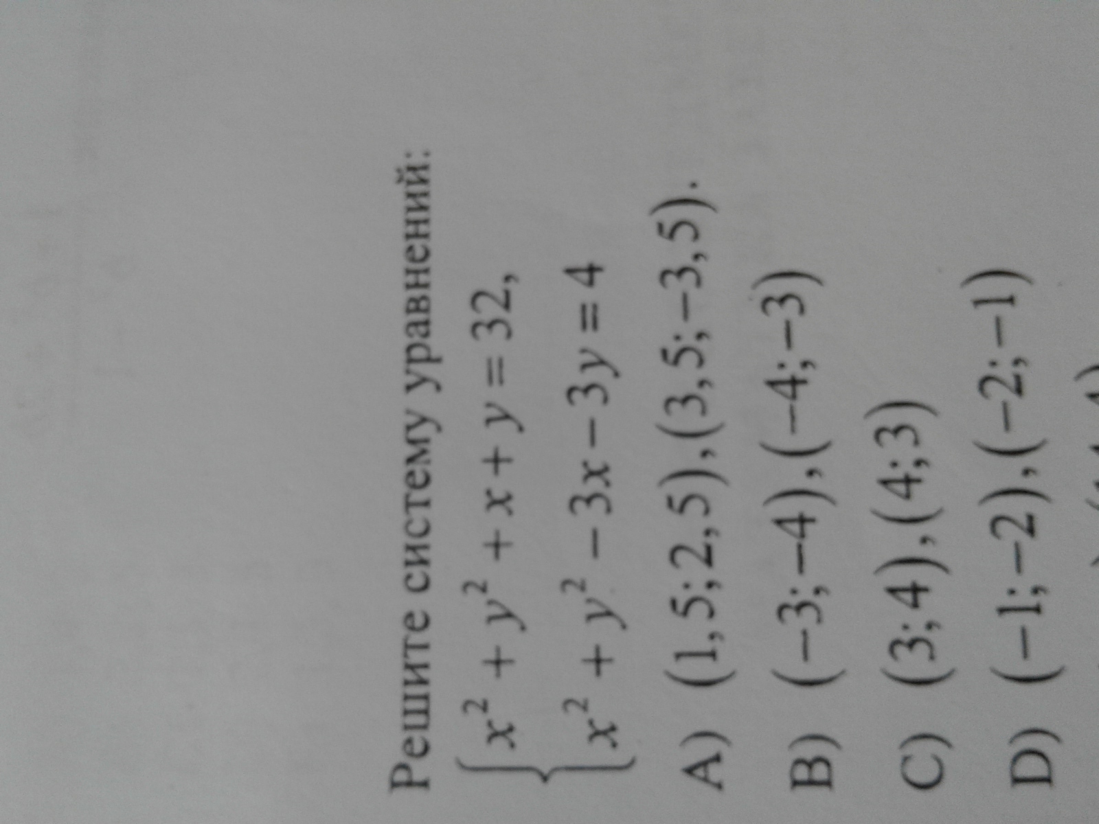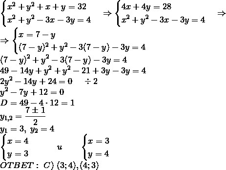 Нужно вычесть из первого уравнения второе, выразить из него x, подставить x во второе, решить его относительно y.