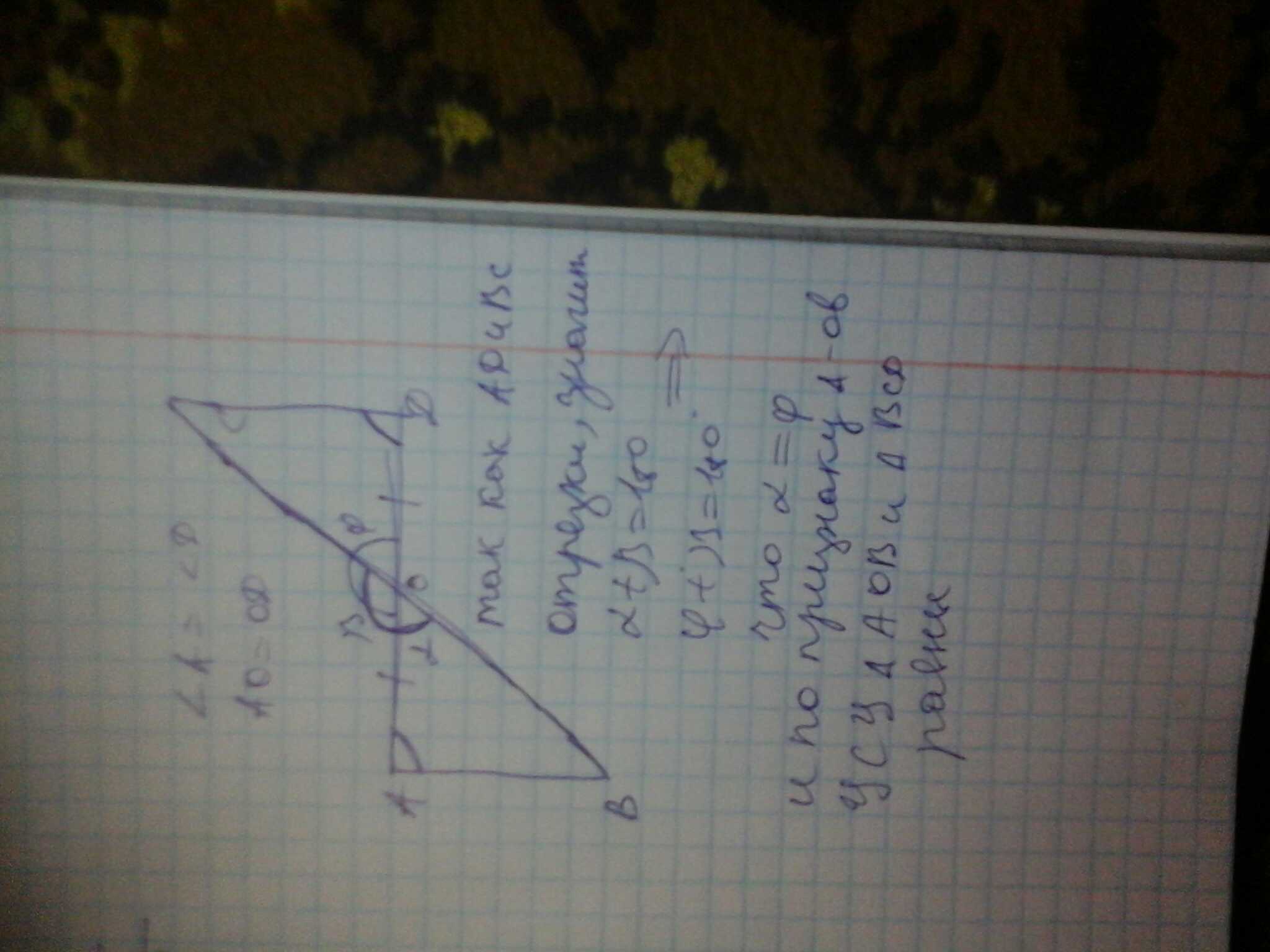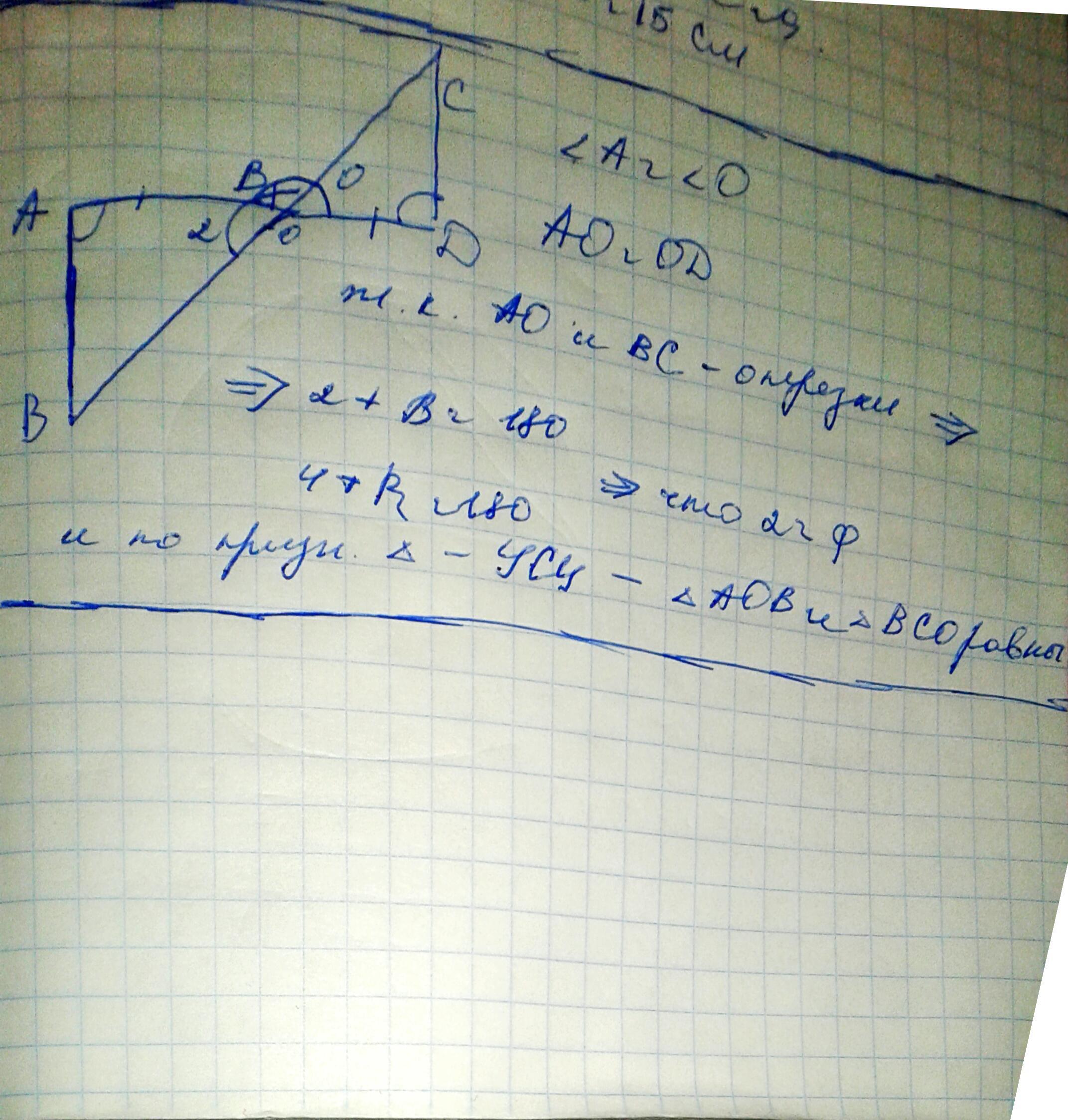 Отрезки AD и BC пересекаются в точке O, которая является серединой отрезка AD, углы BAO и CDO равны.