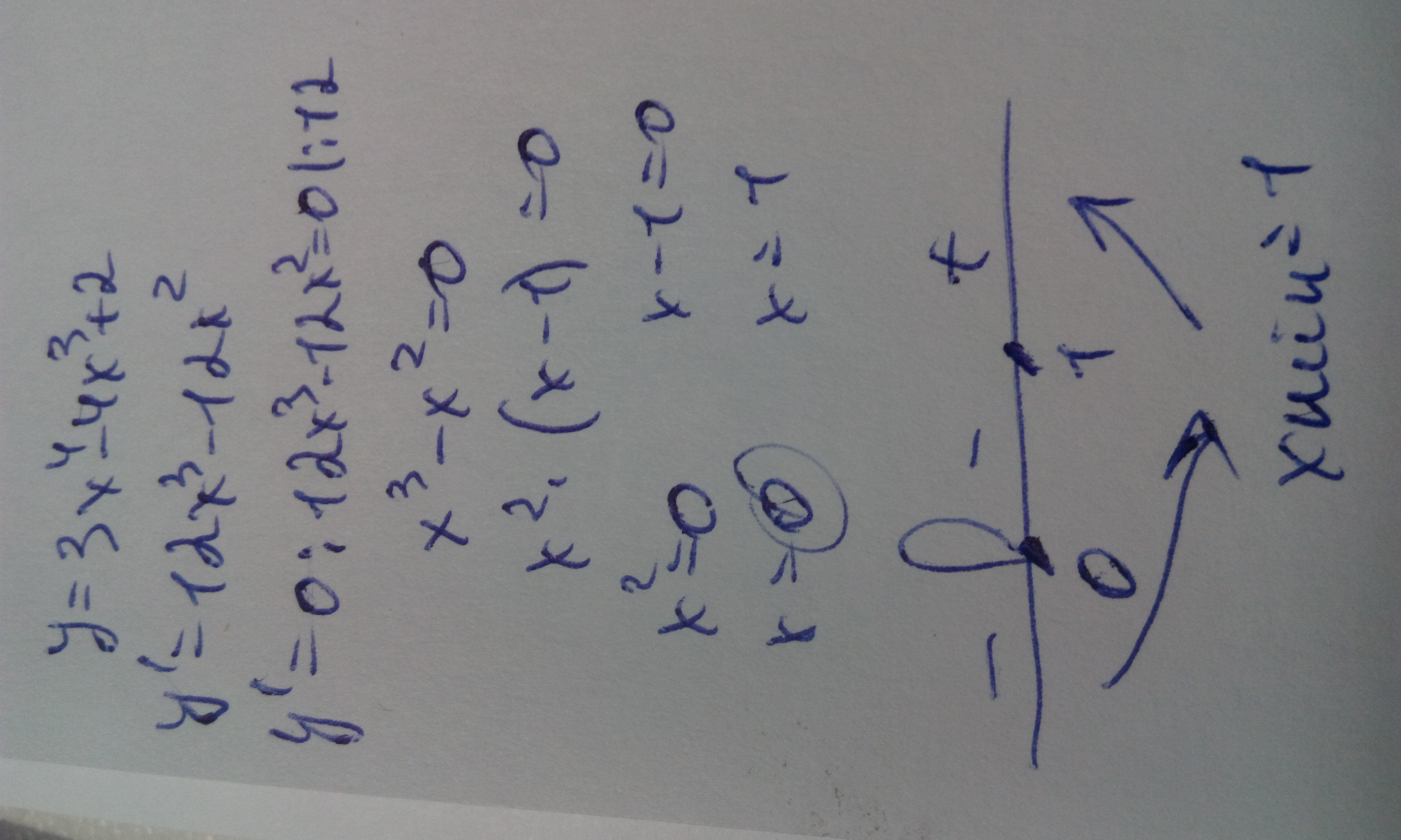 Найдите,пж,срочно, если не сложно. Найдите точку миниума функции у=3х^4-4х^3+2. Расспишите,пж,всё.