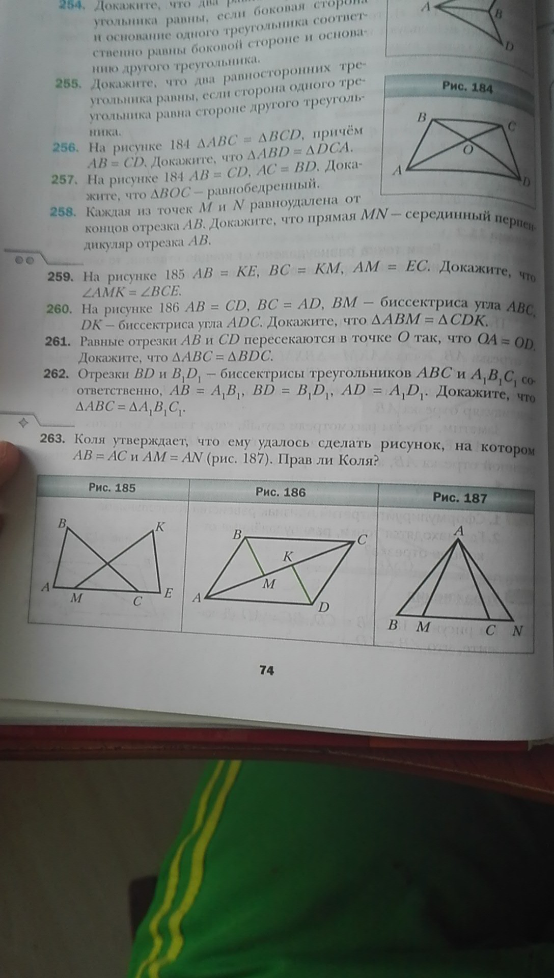 Если АВ=CD и ВС=AD, то АВСD - параллелограмм, а значит, угол АВС равен углу ADC, следовательно угол АВМ= угол СDК. К тому же раз АВСD - параллелограмм, то АВ параллельна CD, а значит, угол ВАС= угол АСD как накрест лежащие. Таким образом, треугольник АВМ = треугольник КСD по стороне и прилежащим к ней углам (АВ=СD и углы, чьи равенства я доказал).