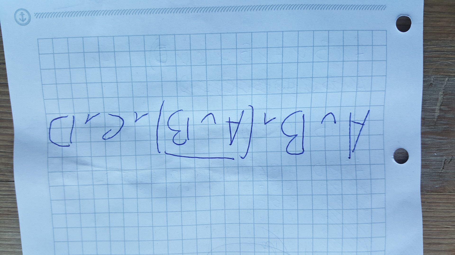 В скобках по ДеМоргану преобразуем, затем раскроем скобки. Получаем Av(B^-A) ^ C ^ D = B ^ C ^ D