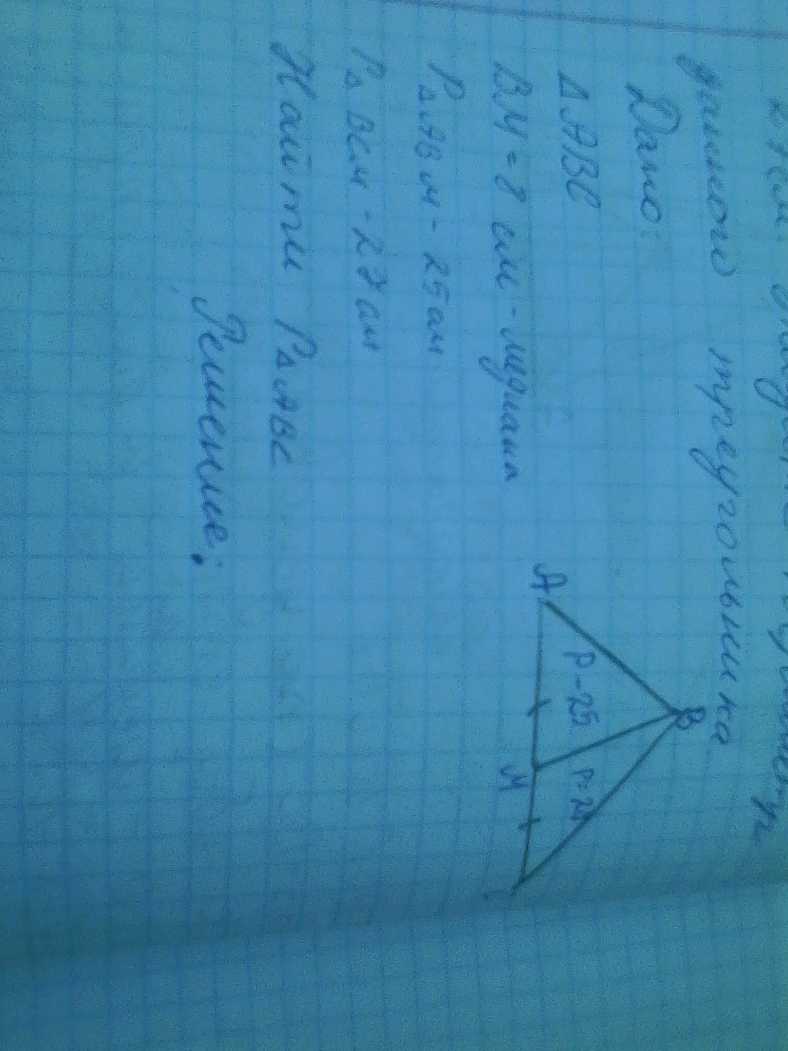 Дам 50 баллов!!!!!Помогите решить!!! В треугольнике проведена медиана длинной 8 см.Медиана делит треугольник на два треугольника с периметрами 25 см и 27 см.Найдите периметр данного треугольника.