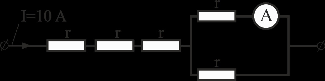так кат амперметр и сопротивление включены параллельно и они одинаковы, то ток делится попалам. Показания амперметра 5 А