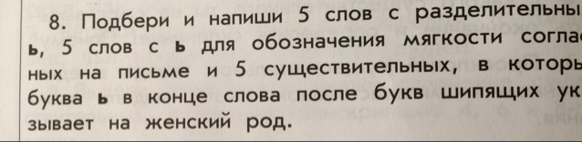Подбери и напиши пять слов с разделительным мягким знаком пять слов с мягким знаком для обозначения на касте согласных на письме и пять существительных катарах Ь в конце слова после букв шипящих указывает на женский род
