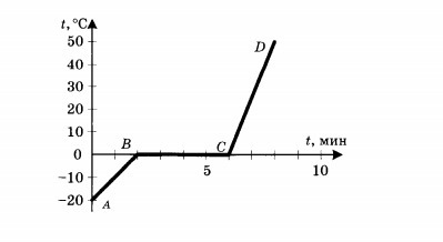 Кусок льда нагрели и расплавили. График этого процесса представлен на рисунке. Определите по нему, сколько минут плавился лед, какому процессу соответствует участок AB графика